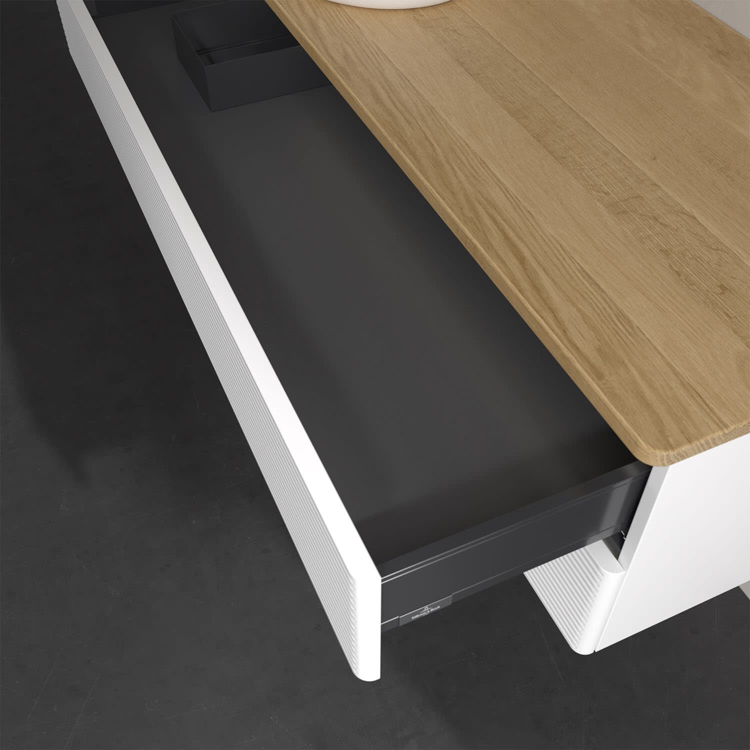 Der wandhängende Antao Waschtischunterschrank von Villeroy & Boch bietet nicht nur jede Menge Stauraum – er ist dank seines naturinspirierten Designs mit seinen abgerundeten Kanten auch noch besonders stilvoll und schafft eine gemütliche Atmosphäre im Badezimmer. Auf der Waschtischplatte bietet sich seitlich des Waschtischs viel Platz für Zahnbürstenbecher oder Seifenspender. Zwei geräumige Auszüge bieten viel Platz, um alles Notwendige zu verstauen und Ordnung zu halten. Öffnen lassen sie sich durch leichten Druck auf die strukturierte Front. Dabei aktiviert sich übrigens die Auszugsbeleuchtung in angenehmem Warmweiß. Dank Vollauszug hat man immer alles im Blick und der Antirutschboden verhindert ein Umfallen oder Verrutschen der Gegenstände. Einfach clever! Für eine besonders leichte Pflege sorgt die mehrschichtig deckend lackierte Oberfläche. Bei der Ausführung in Massivholz wird dank des verarbeiteten Massivholzes jedes Möbel zu einem Unikat, das sich durch das lebendige Naturmaterial durch seine einzigartige Struktur und Maserung auszeichnet.