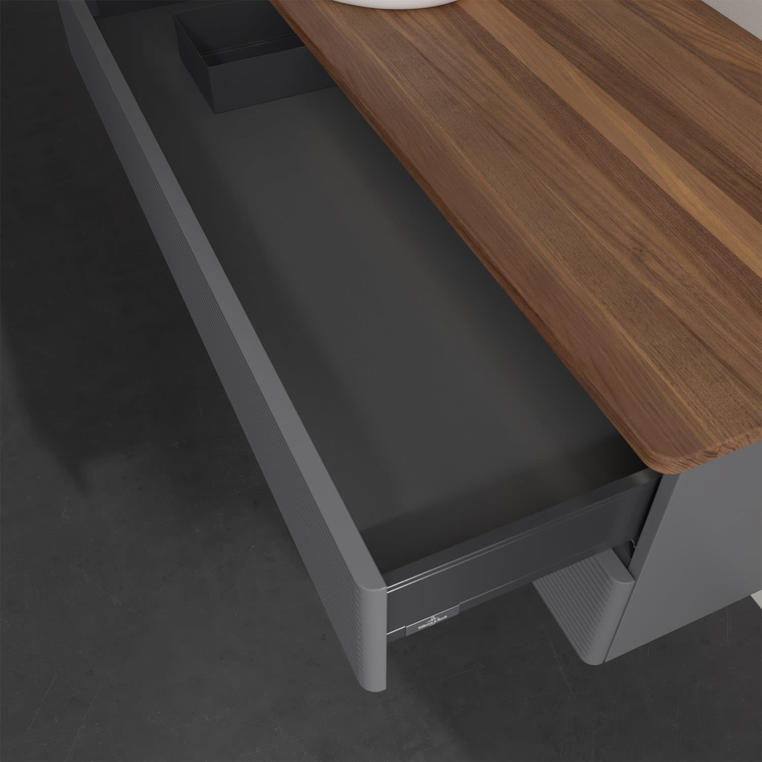 Der wandhängende Antao Waschtischunterschrank von Villeroy & Boch bietet nicht nur jede Menge Stauraum – er ist dank seines naturinspirierten Designs mit seinen abgerundeten Kanten auch noch besonders stilvoll und schafft eine gemütliche Atmosphäre im Badezimmer. Auf der Waschtischplatte bietet sich seitlich des Waschtischs viel Platz für Zahnbürstenbecher oder Seifenspender. Zwei geräumige Auszüge bieten viel Platz, um alles Notwendige zu verstauen und Ordnung zu halten. Öffnen lassen sie sich durch leichten Druck auf die strukturierte Front. Dabei aktiviert sich übrigens die Auszugsbeleuchtung in angenehmem Warmweiß. Dank Vollauszug hat man immer alles im Blick und der Antirutschboden verhindert ein Umfallen oder Verrutschen der Gegenstände. Einfach clever! Für eine besonders leichte Pflege sorgt die mehrschichtig deckend lackierte Oberfläche. Bei der Ausführung in Massivholz wird dank des verarbeiteten Massivholzes jedes Möbel zu einem Unikat, das sich durch das lebendige Naturmaterial durch seine einzigartige Struktur und Maserung auszeichnet.
