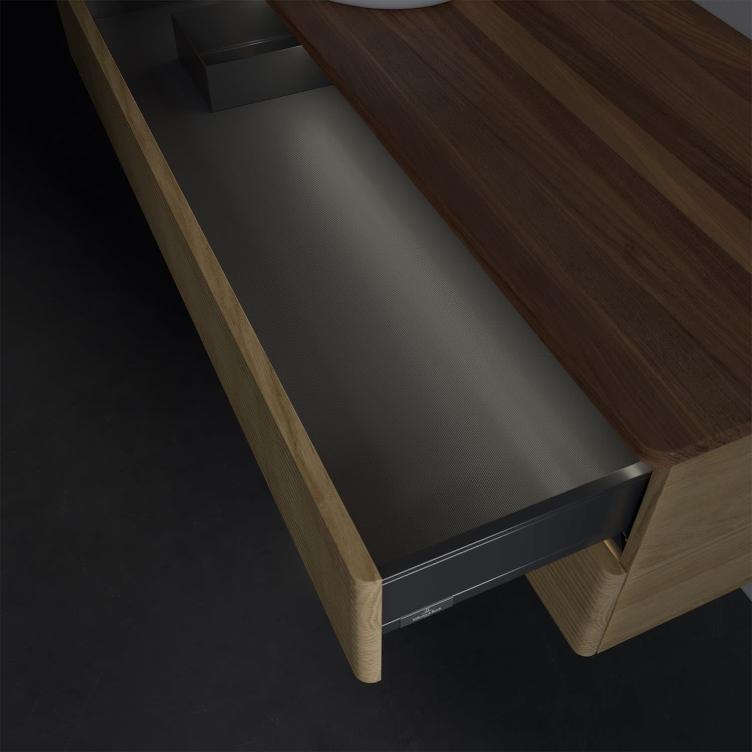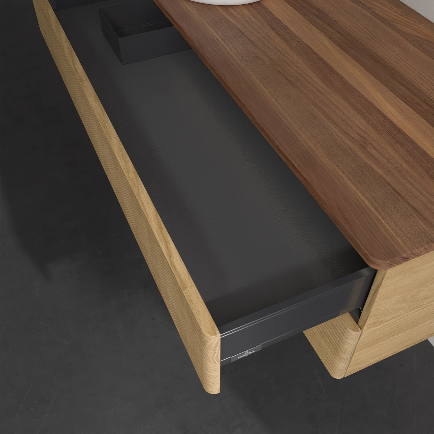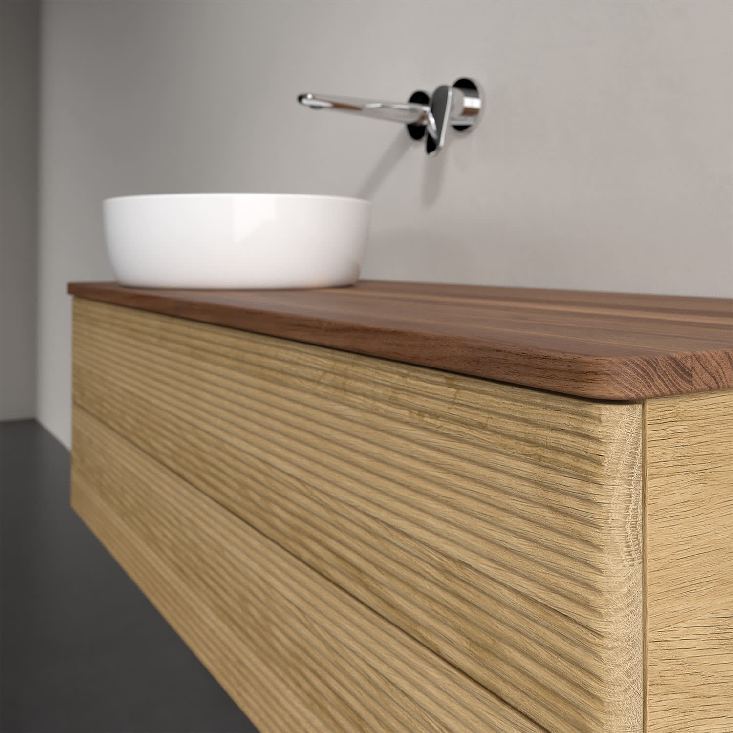 Der wandhängende Antao Waschtischunterschrank von Villeroy & Boch bietet nicht nur jede Menge Stauraum – er ist dank seines naturinspirierten Designs mit seinen abgerundeten Kanten auch noch besonders stilvoll und schafft eine gemütliche Atmosphäre im Badezimmer. Auf der Waschtischplatte bietet sich seitlich des Waschtischs viel Platz für Zahnbürstenbecher oder Seifenspender. Zwei geräumige Auszüge bieten viel Platz, um alles Notwendige zu verstauen und Ordnung zu halten. Öffnen lassen sie sich durch leichten Druck auf die strukturierte Front. Dabei aktiviert sich übrigens die Auszugsbeleuchtung in angenehmem Warmweiß. Dank Vollauszug hat man immer alles im Blick und der Antirutschboden verhindert ein Umfallen oder Verrutschen der Gegenstände. Einfach clever! Für eine besonders leichte Pflege sorgt die mehrschichtig deckend lackierte Oberfläche. Bei der Ausführung in Massivholz wird dank des verarbeiteten Massivholzes jedes Möbel zu einem Unikat, das sich durch das lebendige Naturmaterial durch seine einzigartige Struktur und Maserung auszeichnet.