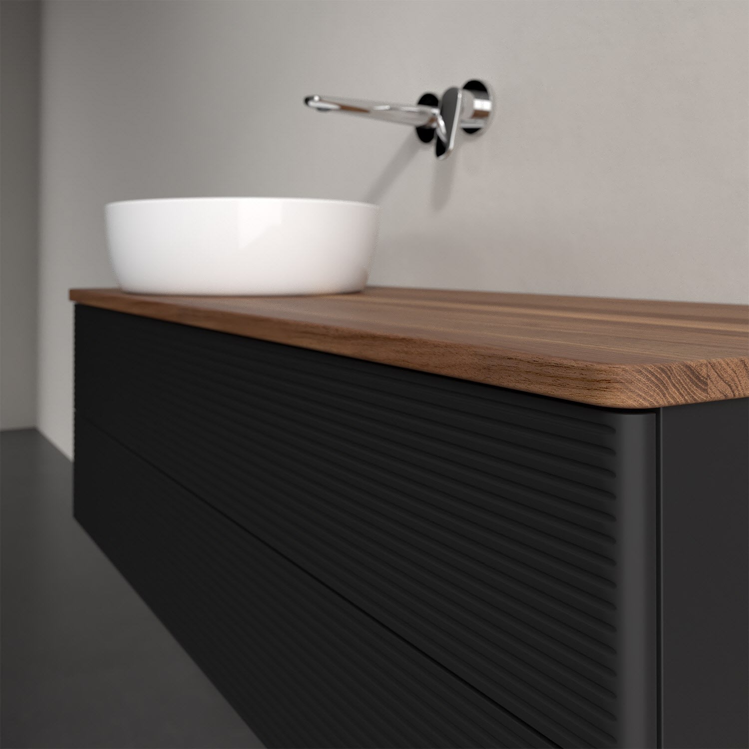 Der wandhängende Antao Waschtischunterschrank von Villeroy & Boch bietet nicht nur jede Menge Stauraum – er ist dank seines naturinspirierten Designs mit seinen abgerundeten Kanten auch noch besonders stilvoll und schafft eine gemütliche Atmosphäre im Badezimmer. Auf der Waschtischplatte bietet sich seitlich des Waschtischs viel Platz für Zahnbürstenbecher oder Seifenspender. Zwei geräumige Auszüge bieten viel Platz, um alles Notwendige zu verstauen und Ordnung zu halten. Öffnen lassen sie sich durch leichten Druck auf die strukturierte Front. Dabei aktiviert sich übrigens die Auszugsbeleuchtung in angenehmem Warmweiß. Dank Vollauszug hat man immer alles im Blick und der Antirutschboden verhindert ein Umfallen oder Verrutschen der Gegenstände. Einfach clever! Für eine besonders leichte Pflege sorgt die mehrschichtig deckend lackierte Oberfläche. Bei der Ausführung in Massivholz wird dank des verarbeiteten Massivholzes jedes Möbel zu einem Unikat, das sich durch das lebendige Naturmaterial durch seine einzigartige Struktur und Maserung auszeichnet.