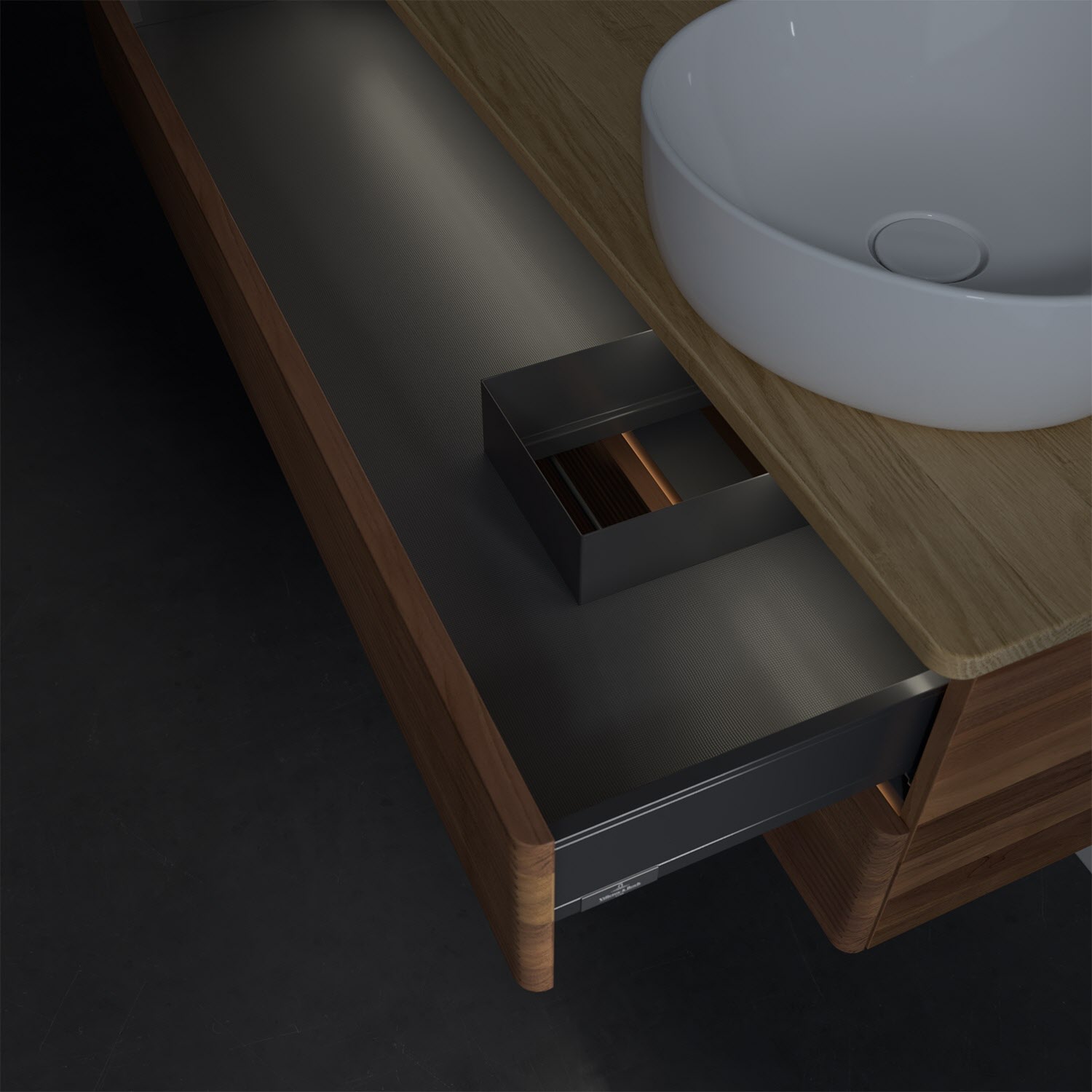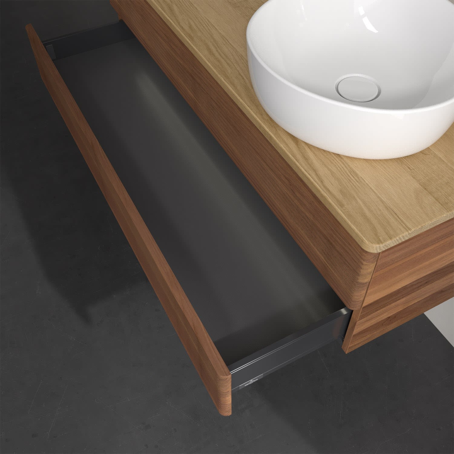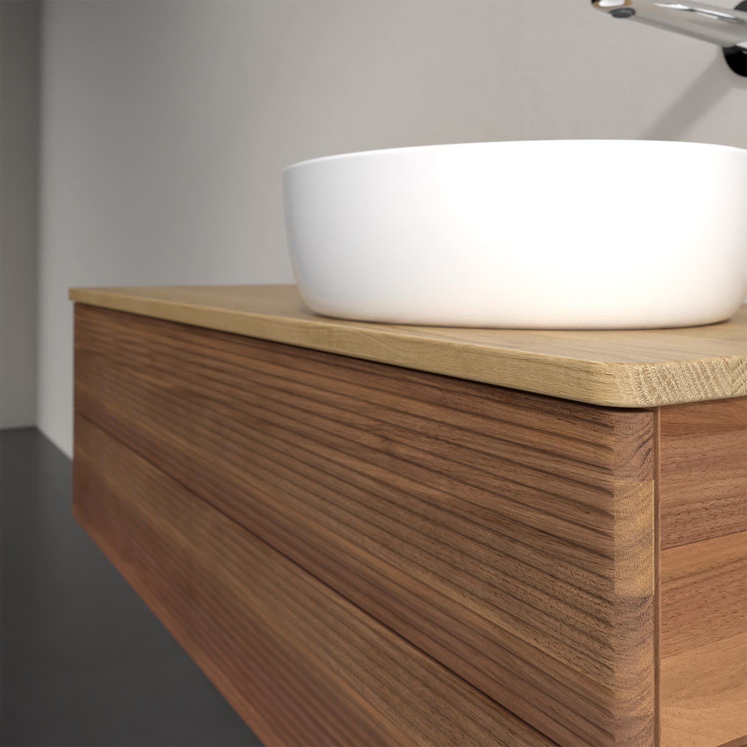 Der wandhängende Antao Waschtischunterschrank von Villeroy & Boch bietet nicht nur jede Menge Stauraum – er ist dank seines naturinspirierten Designs mit seinen abgerundeten Kanten auch noch besonders stilvoll und schafft eine gemütliche Atmosphäre im Badezimmer. Auf der Waschtischplatte bietet sich seitlich des Waschtischs viel Platz für Zahnbürstenbecher oder Seifenspender. Zwei geräumige Auszüge bieten viel Platz, um alles Notwendige zu verstauen und Ordnung zu halten. Öffnen lassen sie sich durch leichten Druck auf die strukturierte Front. Dabei aktiviert sich übrigens die Auszugsbeleuchtung in angenehmem Warmweiß. Dank Vollauszug hat man immer alles im Blick und der Antirutschboden verhindert ein Umfallen oder Verrutschen der Gegenstände. Einfach clever! Für eine besonders leichte Pflege sorgt die mehrschichtig deckend lackierte Oberfläche. Bei der Ausführung in Massivholz wird dank des verarbeiteten Massivholzes jedes Möbel zu einem Unikat, das sich durch das lebendige Naturmaterial durch seine einzigartige Struktur und Maserung auszeichnet.