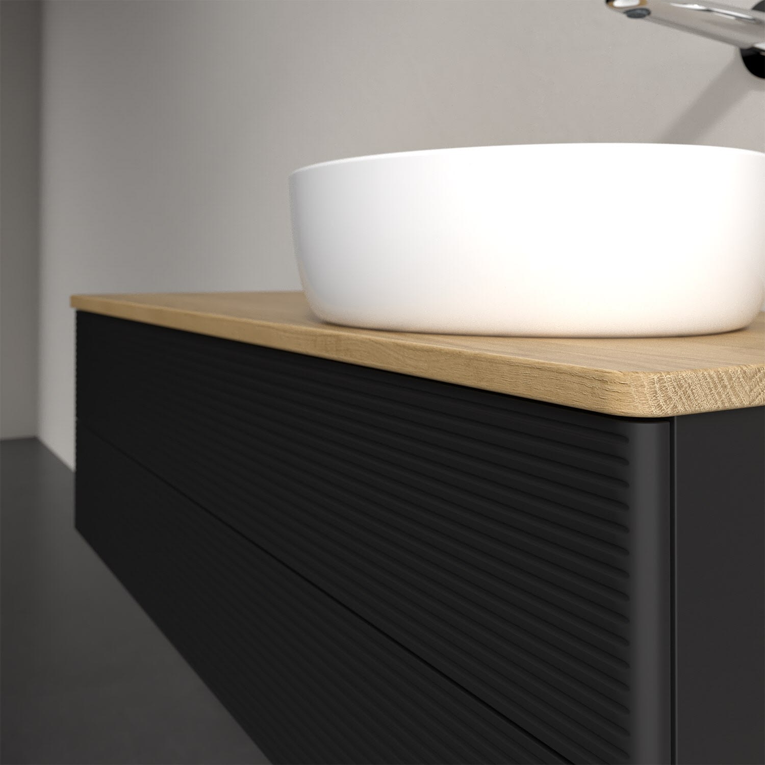 Der wandhängende Antao Waschtischunterschrank von Villeroy & Boch bietet nicht nur jede Menge Stauraum – er ist dank seines naturinspirierten Designs mit seinen abgerundeten Kanten auch noch besonders stilvoll und schafft eine gemütliche Atmosphäre im Badezimmer. Auf der Waschtischplatte bietet sich seitlich des Waschtischs viel Platz für Zahnbürstenbecher oder Seifenspender. Zwei geräumige Auszüge bieten viel Platz, um alles Notwendige zu verstauen und Ordnung zu halten. Öffnen lassen sie sich durch leichten Druck auf die strukturierte Front. Dabei aktiviert sich übrigens die Auszugsbeleuchtung in angenehmem Warmweiß. Dank Vollauszug hat man immer alles im Blick und der Antirutschboden verhindert ein Umfallen oder Verrutschen der Gegenstände. Einfach clever! Für eine besonders leichte Pflege sorgt die mehrschichtig deckend lackierte Oberfläche. Bei der Ausführung in Massivholz wird dank des verarbeiteten Massivholzes jedes Möbel zu einem Unikat, das sich durch das lebendige Naturmaterial durch seine einzigartige Struktur und Maserung auszeichnet.