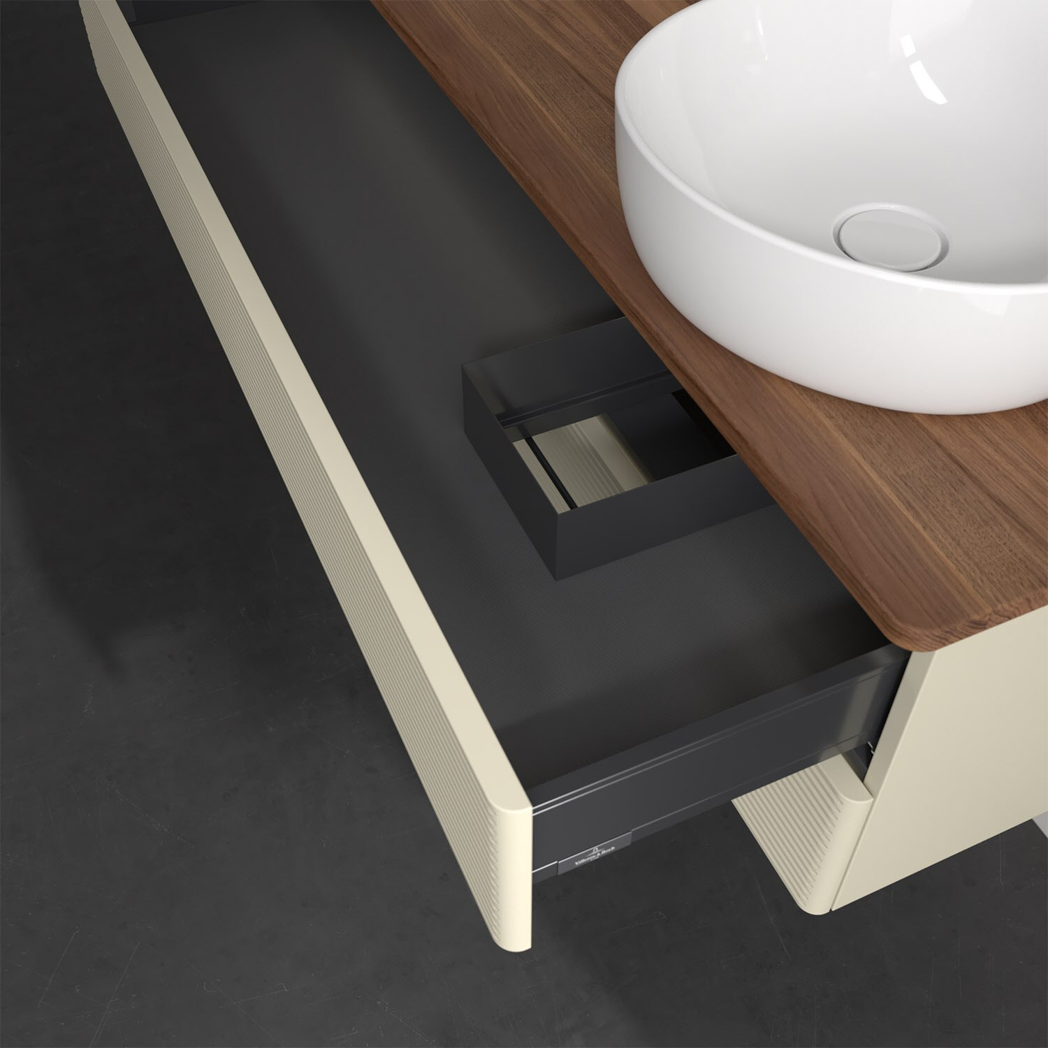 - kein Umfallen oder Verrutschen von Pflegeprodukten in den Schubladen dank rutschhemmendem Boden
