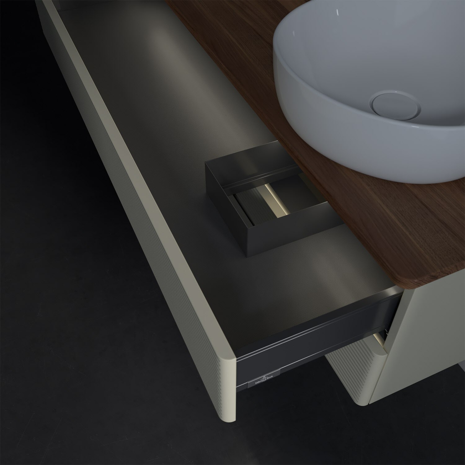 - in Schublade integrierte LED-Leiste mit warmweißem Licht zur Beleuchtung des Innenlebens