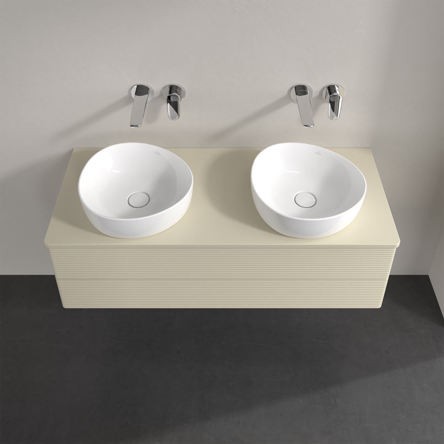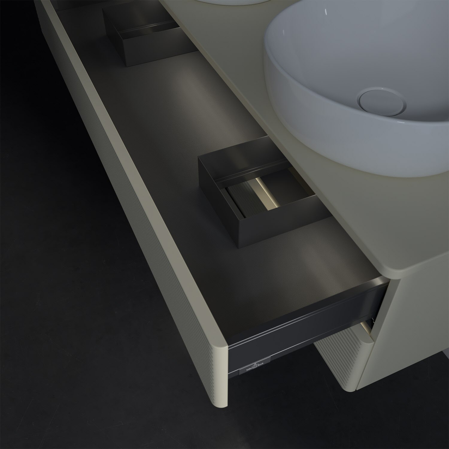 Der wandhängende Antao Waschtischunterschrank von Villeroy & Boch bietet nicht nur jede Menge Stauraum – er ist dank seines naturinspirierten Designs mit seinen abgerundeten Kanten auch noch besonders stilvoll und schafft eine gemütliche Atmosphäre im Badezimmer. Kombiniert mit zwei passenden Aufsatzwaschtischen also die ideale Wahl. Zwei geräumige Auszüge bieten viel Platz, um alles Notwendige zu verstauen und Ordnung zu halten. Öffnen lassen sie sich durch leichten Druck auf die strukturierte Front. Dabei aktiviert sich übrigens die Auszugsbeleuchtung in angenehmem Warmweiß. Dank Vollauszug hat man immer alles im Blick und der Antirutschboden verhindert ein Umfallen oder Verrutschen der Gegenstände. Einfach clever! Für eine besonders leichte Pflege sorgt die mehrschichtig deckend lackierte Oberfläche.
