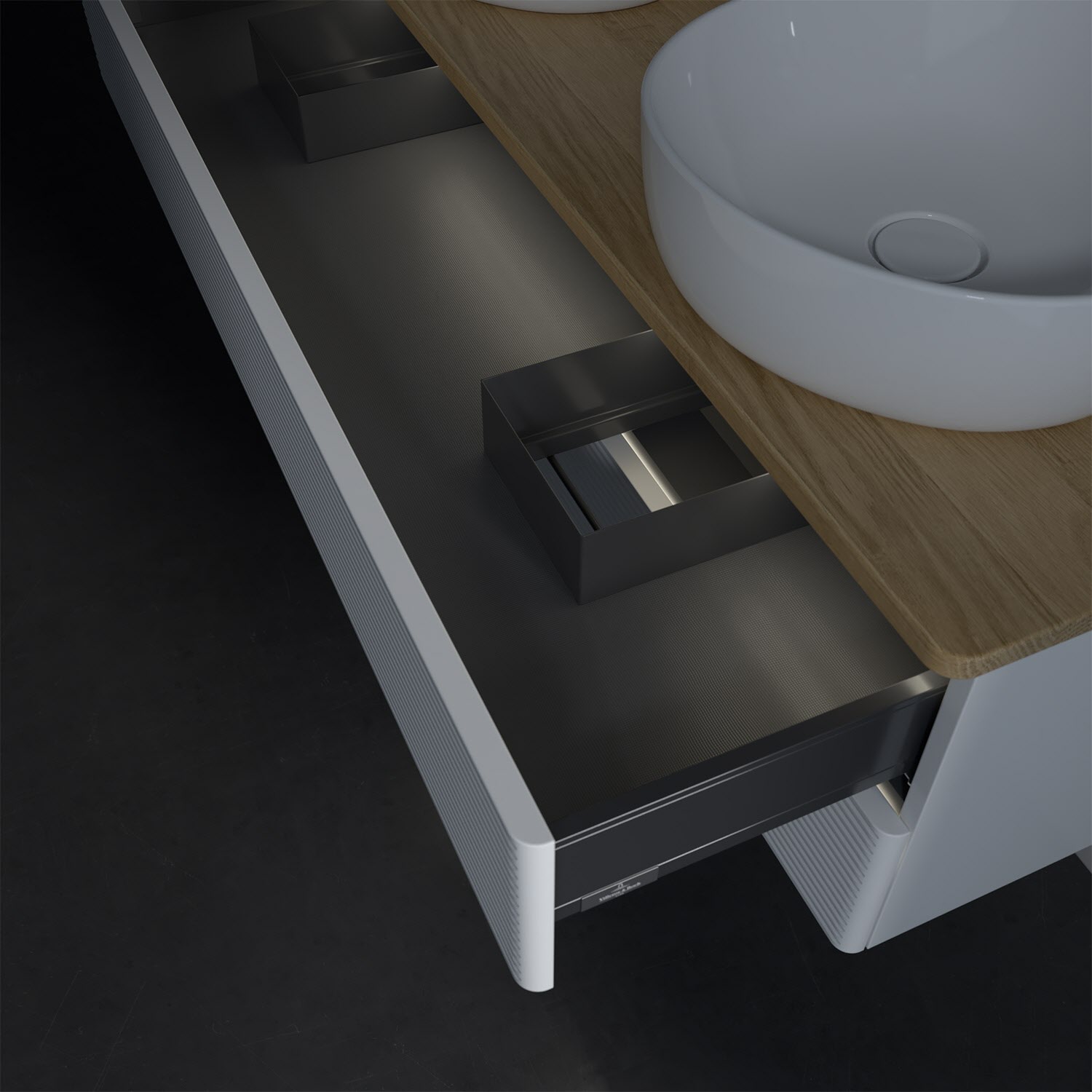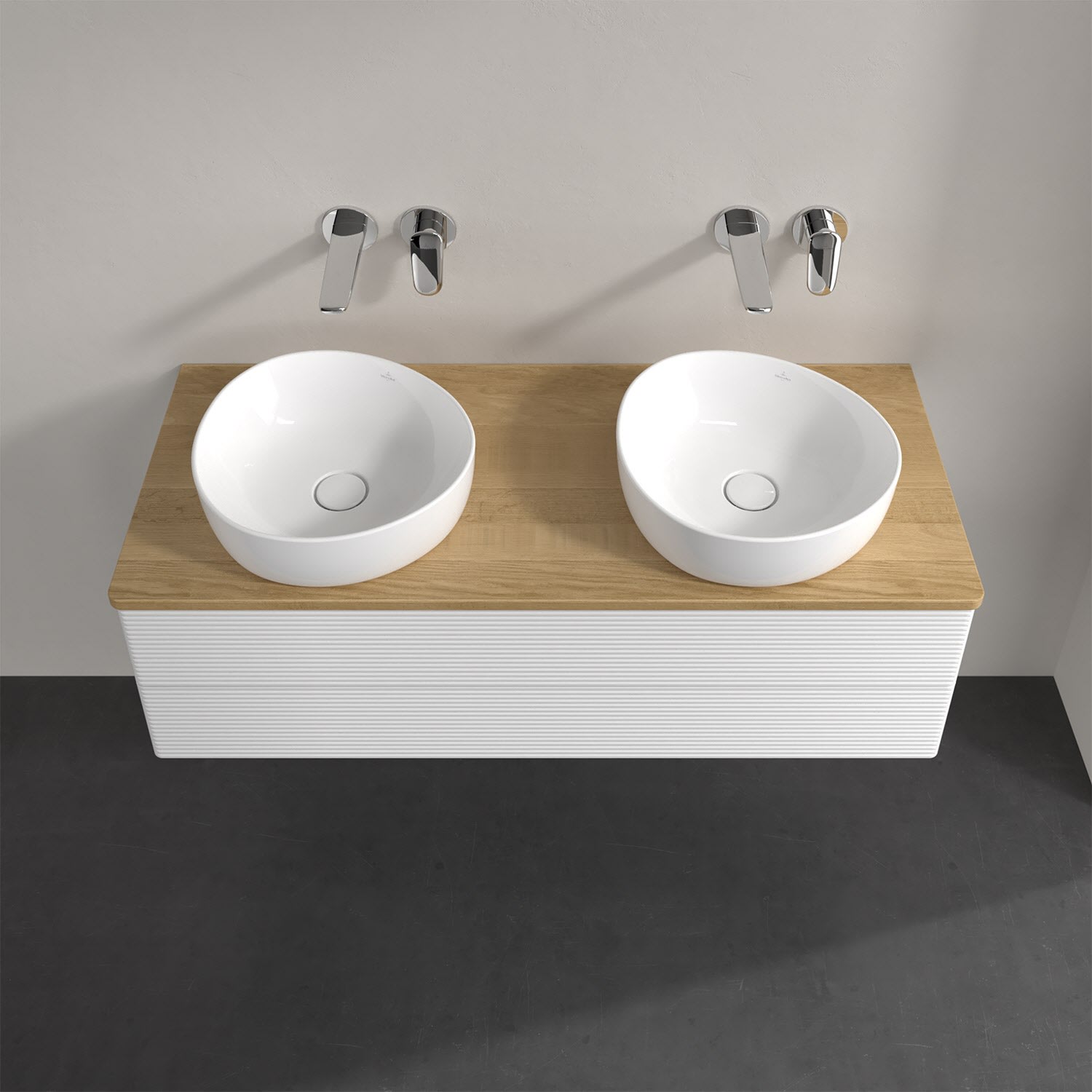 Der wandhängende Antao Waschtischunterschrank von Villeroy & Boch bietet nicht nur jede Menge Stauraum – er ist dank seines naturinspirierten Designs mit seinen abgerundeten Kanten auch noch besonders stilvoll und schafft eine gemütliche Atmosphäre im Badezimmer. Kombiniert mit zwei passenden Aufsatzwaschtischen also die ideale Wahl. Zwei geräumige Auszüge bieten viel Platz, um alles Notwendige zu verstauen und Ordnung zu halten. Öffnen lassen sie sich durch leichten Druck auf die strukturierte Front. Dabei aktiviert sich übrigens die Auszugsbeleuchtung in angenehmem Warmweiß. Dank Vollauszug hat man immer alles im Blick und der Antirutschboden verhindert ein Umfallen oder Verrutschen der Gegenstände. Einfach clever! Für eine besonders leichte Pflege sorgt die mehrschichtig deckend lackierte Oberfläche. Bei der Ausführung in Massivholz wird dank des verarbeiteten Massivholzes jedes Möbel zu einem Unikat, das sich durch das lebendige Naturmaterial durch seine einzigartige Struktur und Maserung auszeichnet.