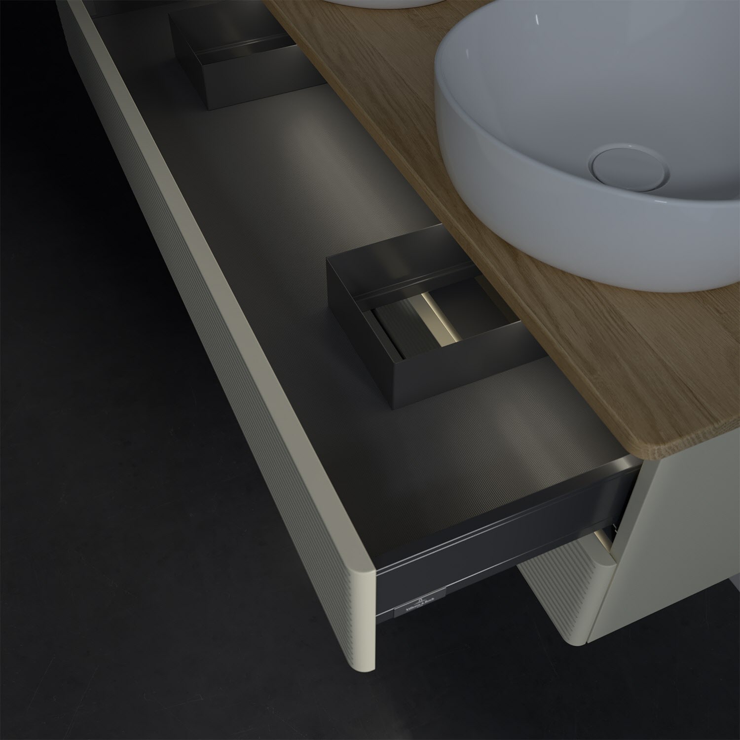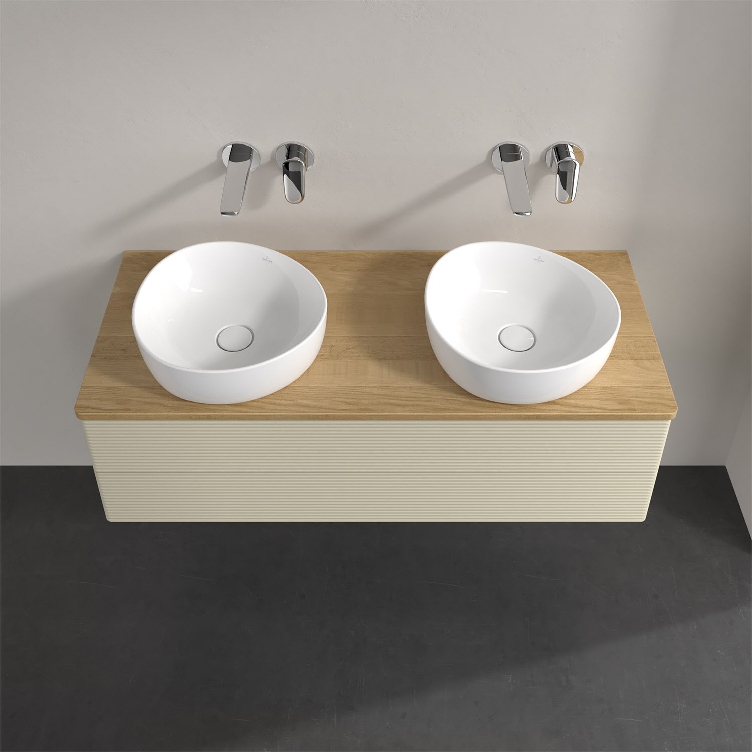 Der wandhängende Antao Waschtischunterschrank von Villeroy & Boch bietet nicht nur jede Menge Stauraum – er ist dank seines naturinspirierten Designs mit seinen abgerundeten Kanten auch noch besonders stilvoll und schafft eine gemütliche Atmosphäre im Badezimmer. Kombiniert mit zwei passenden Aufsatzwaschtischen also die ideale Wahl. Zwei geräumige Auszüge bieten viel Platz, um alles Notwendige zu verstauen und Ordnung zu halten. Öffnen lassen sie sich durch leichten Druck auf die strukturierte Front. Dabei aktiviert sich übrigens die Auszugsbeleuchtung in angenehmem Warmweiß. Dank Vollauszug hat man immer alles im Blick und der Antirutschboden verhindert ein Umfallen oder Verrutschen der Gegenstände. Einfach clever! Für eine besonders leichte Pflege sorgt die mehrschichtig deckend lackierte Oberfläche. Bei der Ausführung in Massivholz wird dank des verarbeiteten Massivholzes jedes Möbel zu einem Unikat, das sich durch das lebendige Naturmaterial durch seine einzigartige Struktur und Maserung auszeichnet.