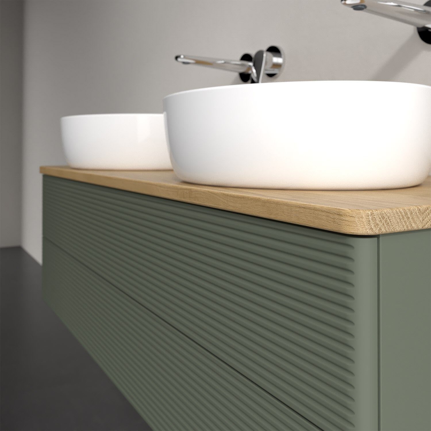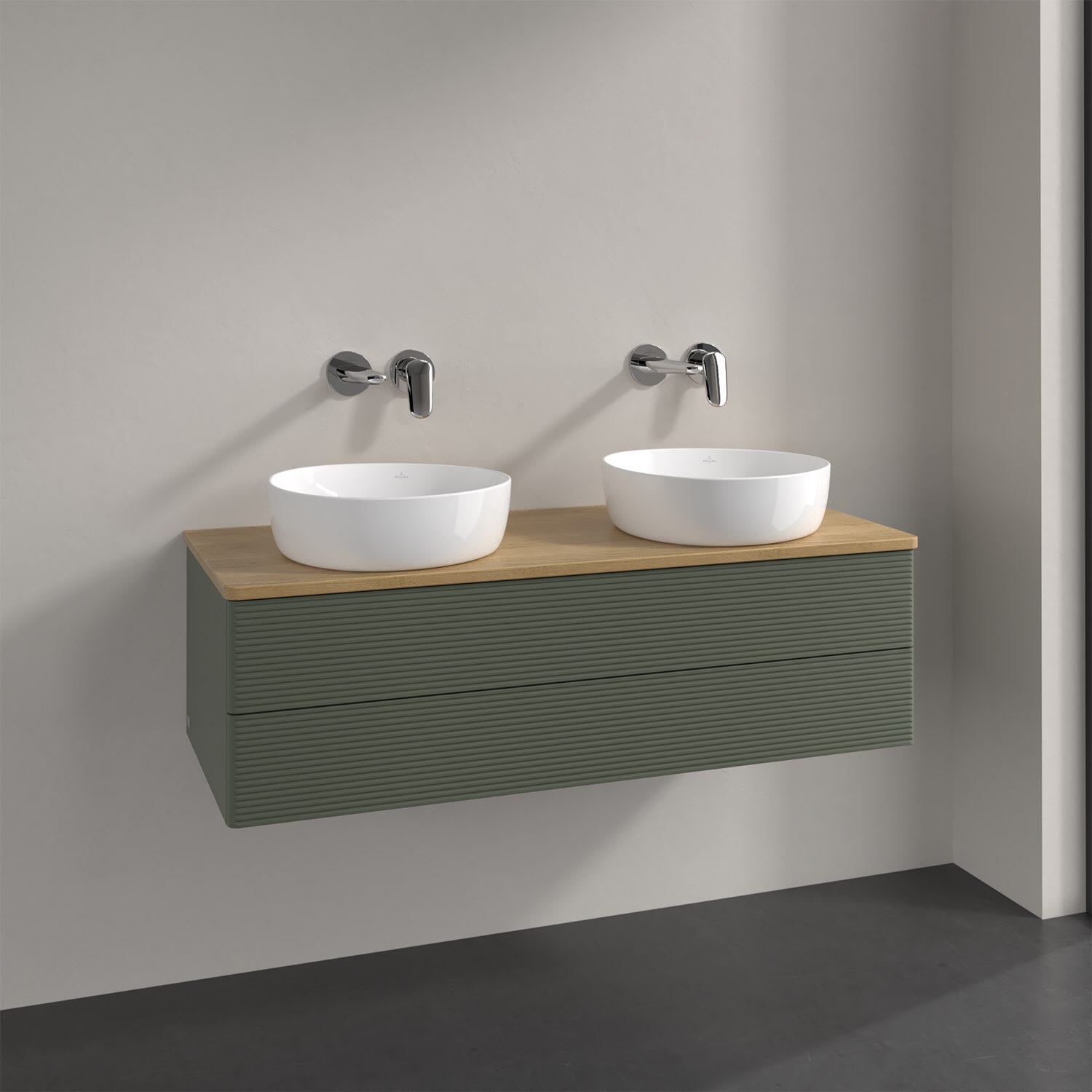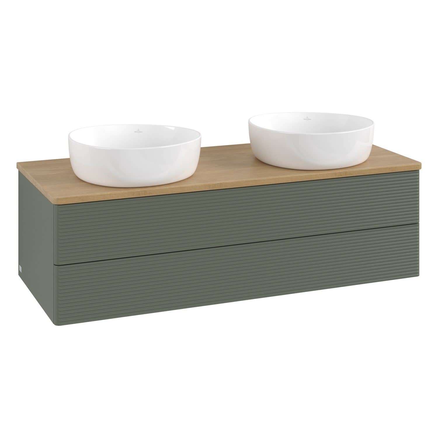 Der wandhängende Antao Waschtischunterschrank von Villeroy & Boch bietet nicht nur jede Menge Stauraum – er ist dank seines naturinspirierten Designs mit seinen abgerundeten Kanten auch noch besonders stilvoll und schafft eine gemütliche Atmosphäre im Badezimmer. Kombiniert mit zwei passenden Aufsatzwaschtischen also die ideale Wahl. Zwei geräumige Auszüge bieten viel Platz, um alles Notwendige zu verstauen und Ordnung zu halten. Öffnen lassen sie sich durch leichten Druck auf die strukturierte Front. Dabei aktiviert sich übrigens die Auszugsbeleuchtung in angenehmem Warmweiß. Dank Vollauszug hat man immer alles im Blick und der Antirutschboden verhindert ein Umfallen oder Verrutschen der Gegenstände. Einfach clever! Für eine besonders leichte Pflege sorgt die mehrschichtig deckend lackierte Oberfläche. Bei der Ausführung in Massivholz wird dank des verarbeiteten Massivholzes jedes Möbel zu einem Unikat, das sich durch das lebendige Naturmaterial durch seine einzigartige Struktur und Maserung auszeichnet.