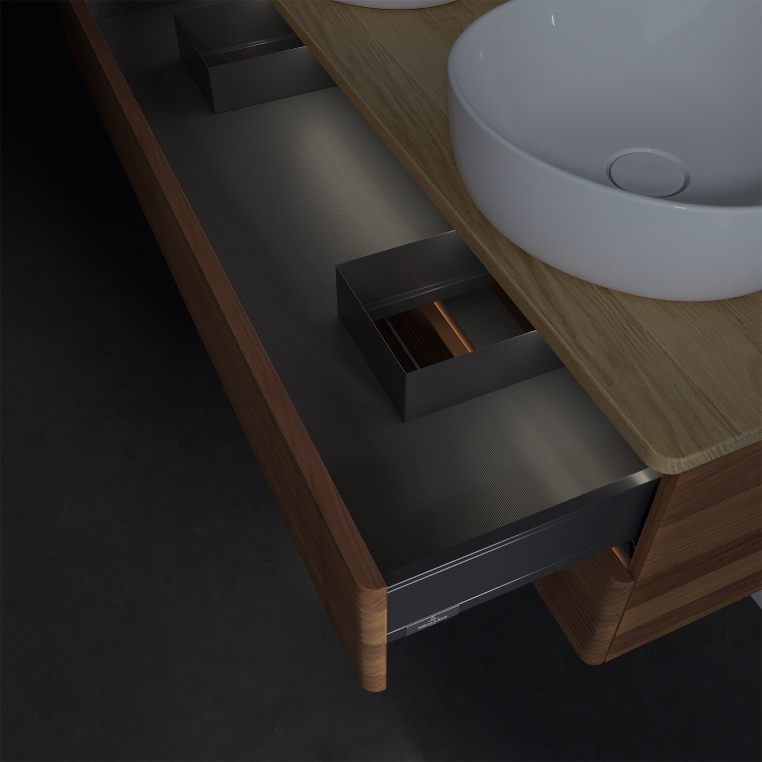 Der wandhängende Antao Waschtischunterschrank von Villeroy & Boch bietet nicht nur jede Menge Stauraum – er ist dank seines naturinspirierten Designs mit seinen abgerundeten Kanten auch noch besonders stilvoll und schafft eine gemütliche Atmosphäre im Badezimmer. Kombiniert mit zwei passenden Aufsatzwaschtischen also die ideale Wahl. Zwei geräumige Auszüge bieten viel Platz, um alles Notwendige zu verstauen und Ordnung zu halten. Öffnen lassen sie sich durch leichten Druck auf die strukturierte Front. Dabei aktiviert sich übrigens die Auszugsbeleuchtung in angenehmem Warmweiß. Dank Vollauszug hat man immer alles im Blick und der Antirutschboden verhindert ein Umfallen oder Verrutschen der Gegenstände. Einfach clever! Für eine besonders leichte Pflege sorgt die mehrschichtig deckend lackierte Oberfläche. Bei der Ausführung in Massivholz wird dank des verarbeiteten Massivholzes jedes Möbel zu einem Unikat, das sich durch das lebendige Naturmaterial durch seine einzigartige Struktur und Maserung auszeichnet.