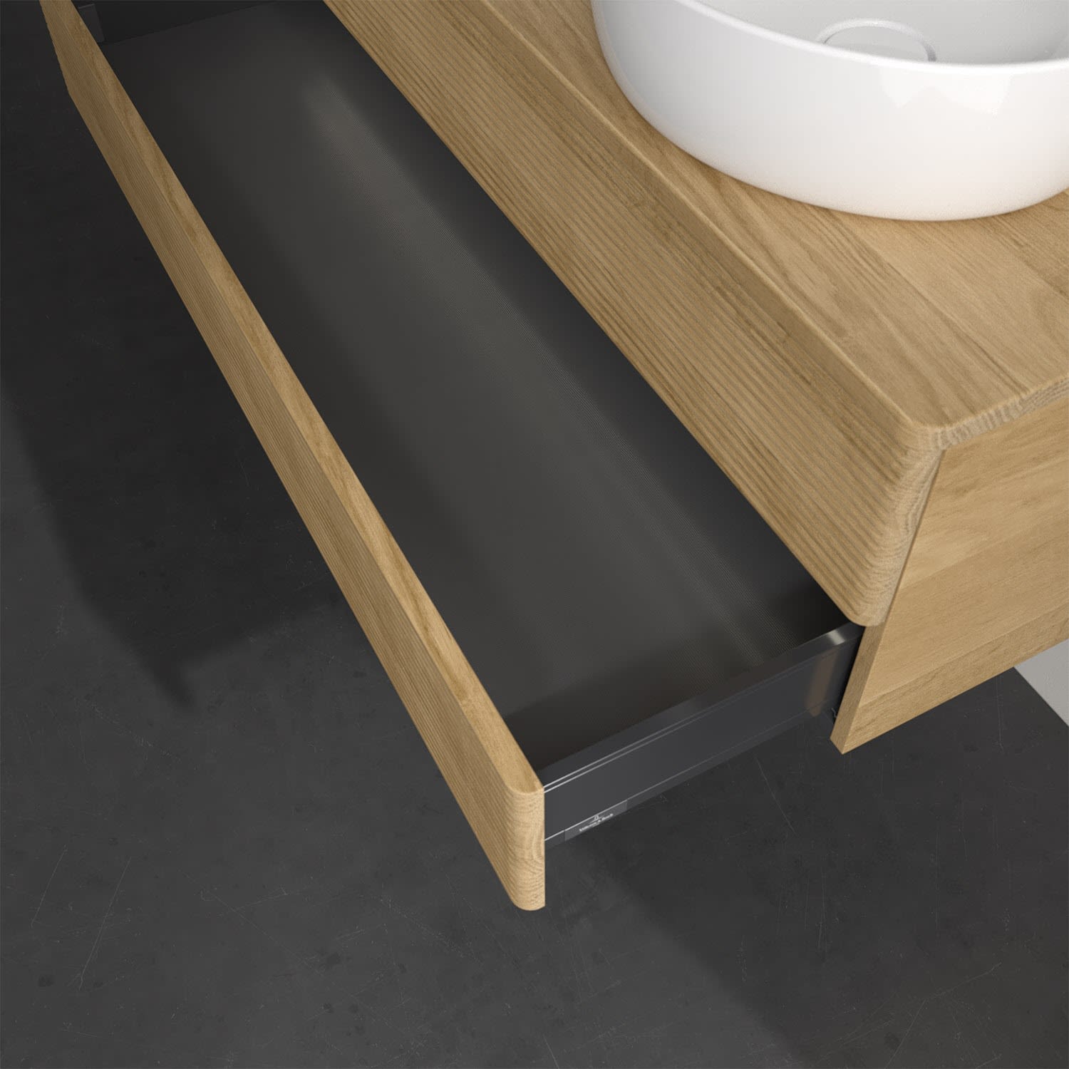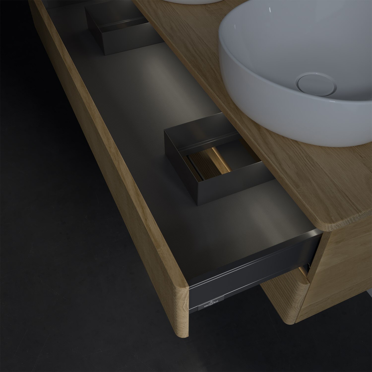 Der wandhängende Antao Waschtischunterschrank von Villeroy & Boch bietet nicht nur jede Menge Stauraum – er ist dank seines naturinspirierten Designs mit seinen abgerundeten Kanten auch noch besonders stilvoll und schafft eine gemütliche Atmosphäre im Badezimmer. Kombiniert mit zwei passenden Aufsatzwaschtischen also die ideale Wahl. Zwei geräumige Auszüge bieten viel Platz, um alles Notwendige zu verstauen und Ordnung zu halten. Öffnen lassen sie sich durch leichten Druck auf die strukturierte Front. Dabei aktiviert sich übrigens die Auszugsbeleuchtung in angenehmem Warmweiß. Dank Vollauszug hat man immer alles im Blick und der Antirutschboden verhindert ein Umfallen oder Verrutschen der Gegenstände. Einfach clever! Für eine besonders leichte Pflege sorgt die mehrschichtig deckend lackierte Oberfläche. Bei der Ausführung in Massivholz wird dank des verarbeiteten Massivholzes jedes Möbel zu einem Unikat, das sich durch das lebendige Naturmaterial durch seine einzigartige Struktur und Maserung auszeichnet.