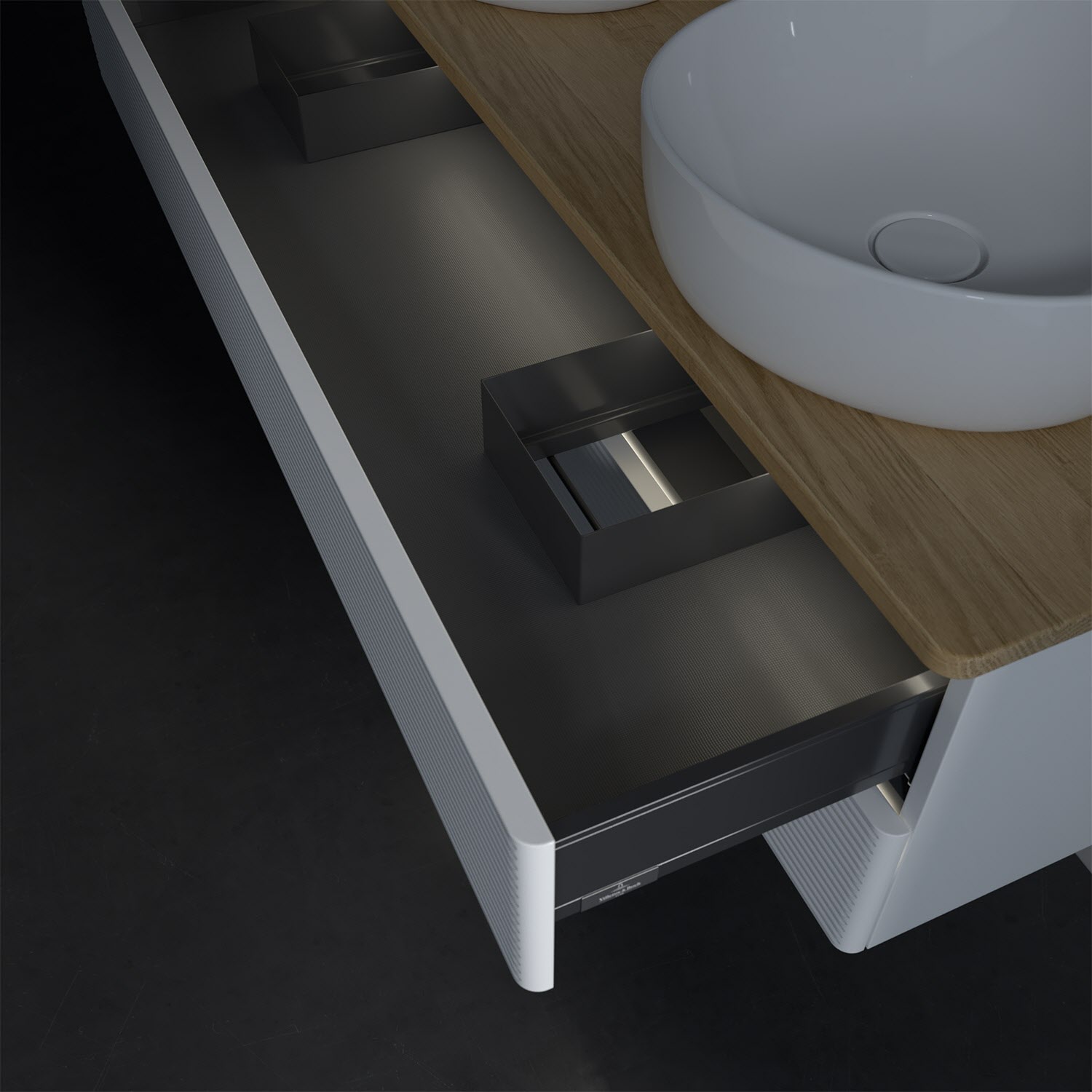 Der wandhängende Antao Waschtischunterschrank von Villeroy & Boch bietet nicht nur jede Menge Stauraum – er ist dank seines naturinspirierten Designs mit seinen abgerundeten Kanten auch noch besonders stilvoll und schafft eine gemütliche Atmosphäre im Badezimmer. Kombiniert mit zwei passenden Aufsatzwaschtischen also die ideale Wahl. Zwei geräumige Auszüge bieten viel Platz, um alles Notwendige zu verstauen und Ordnung zu halten. Öffnen lassen sie sich durch leichten Druck auf die strukturierte Front. Dabei aktiviert sich übrigens die Auszugsbeleuchtung in angenehmem Warmweiß. Dank Vollauszug hat man immer alles im Blick und der Antirutschboden verhindert ein Umfallen oder Verrutschen der Gegenstände. Einfach clever! Für eine besonders leichte Pflege sorgt die mehrschichtig deckend lackierte Oberfläche. Bei der Ausführung in Massivholz wird dank des verarbeiteten Massivholzes jedes Möbel zu einem Unikat, das sich durch das lebendige Naturmaterial durch seine einzigartige Struktur und Maserung auszeichnet.
