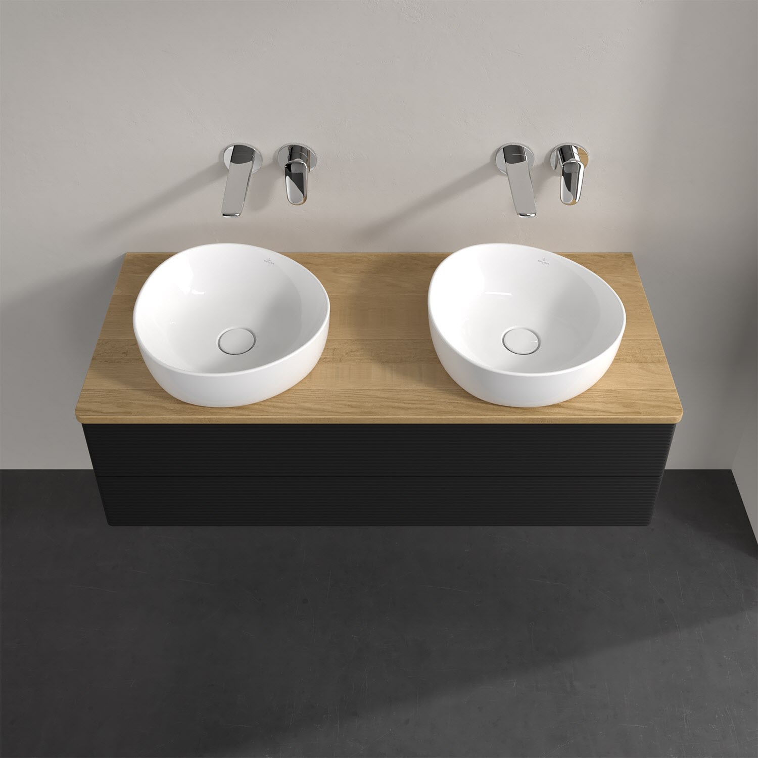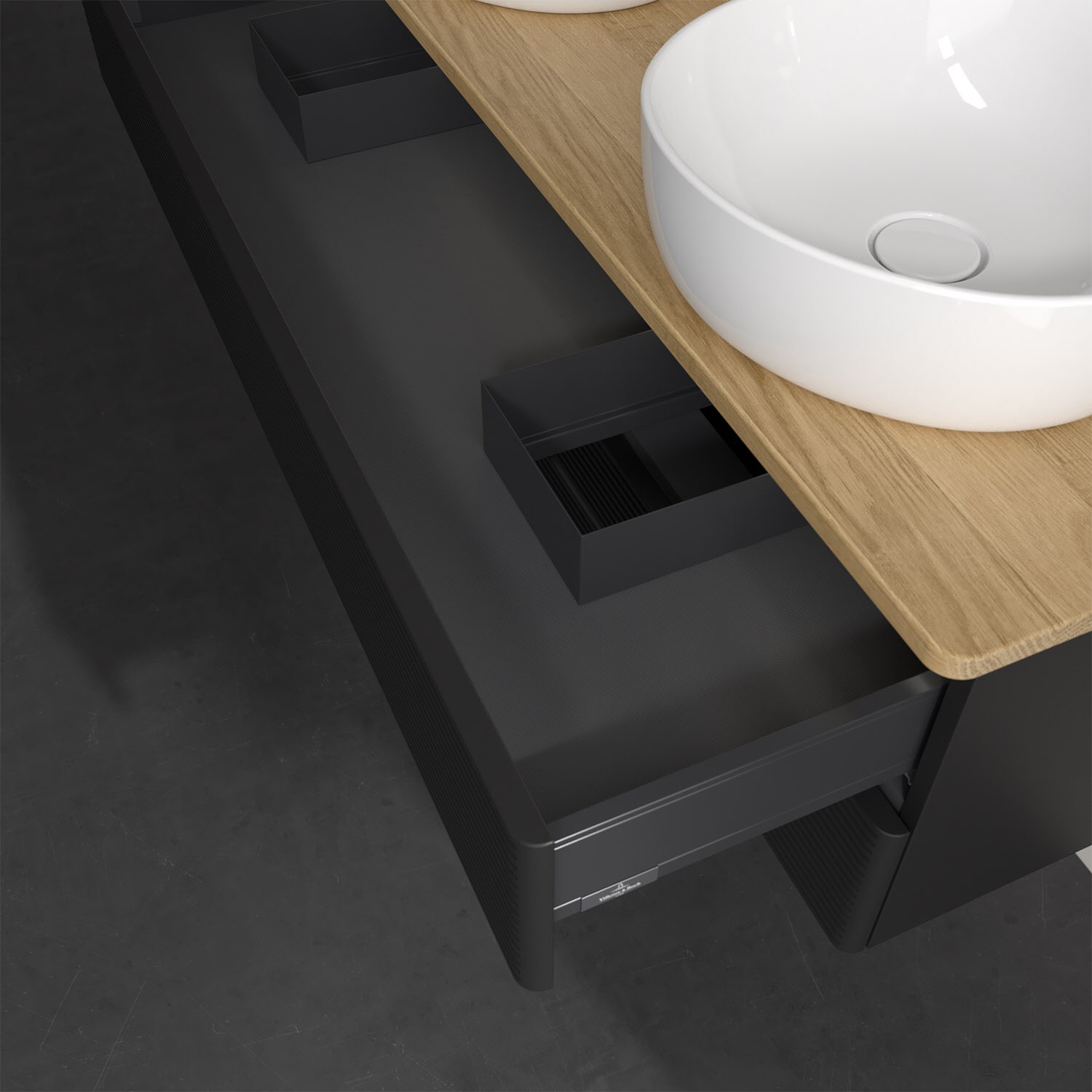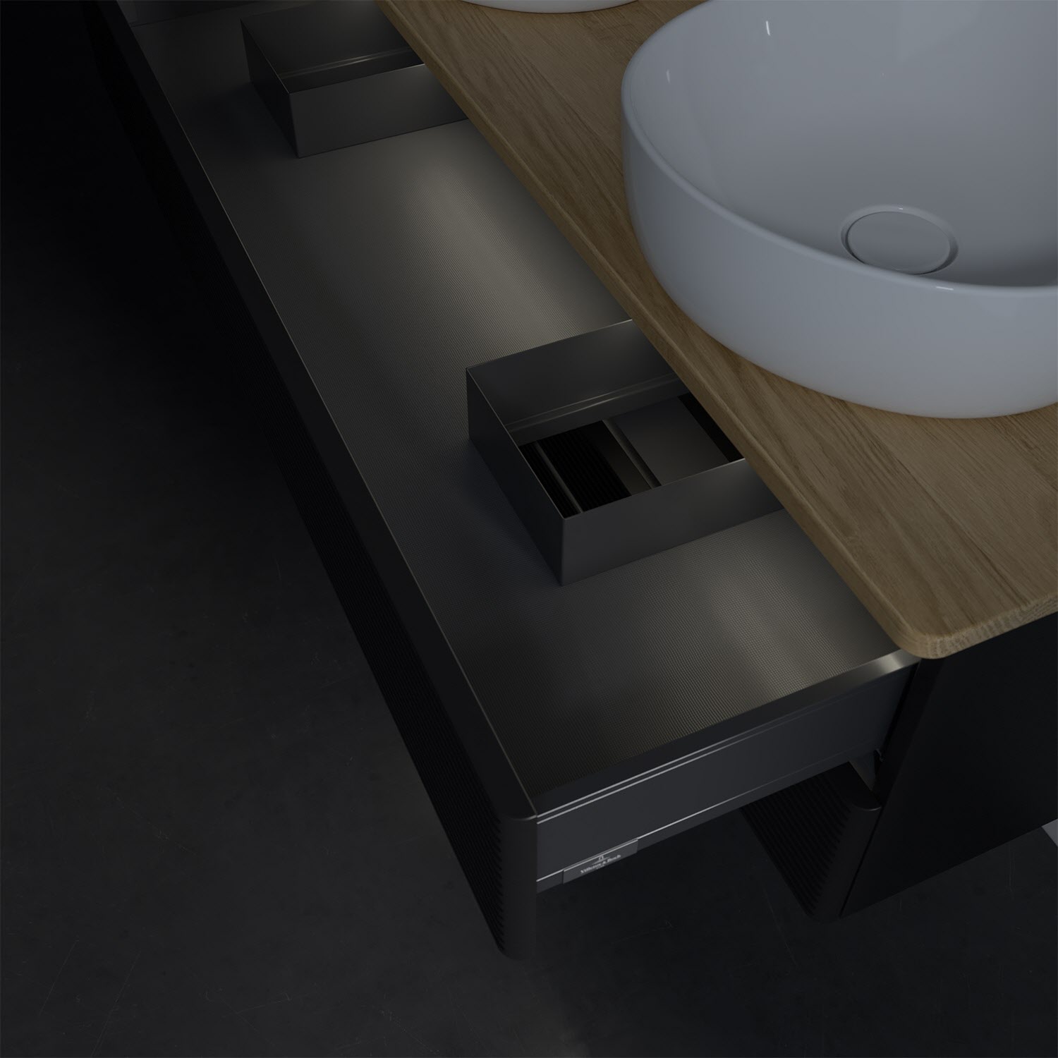 Der wandhängende Antao Waschtischunterschrank von Villeroy & Boch bietet nicht nur jede Menge Stauraum – er ist dank seines naturinspirierten Designs mit seinen abgerundeten Kanten auch noch besonders stilvoll und schafft eine gemütliche Atmosphäre im Badezimmer. Kombiniert mit zwei passenden Aufsatzwaschtischen also die ideale Wahl. Zwei geräumige Auszüge bieten viel Platz, um alles Notwendige zu verstauen und Ordnung zu halten. Öffnen lassen sie sich durch leichten Druck auf die strukturierte Front. Dabei aktiviert sich übrigens die Auszugsbeleuchtung in angenehmem Warmweiß. Dank Vollauszug hat man immer alles im Blick und der Antirutschboden verhindert ein Umfallen oder Verrutschen der Gegenstände. Einfach clever! Für eine besonders leichte Pflege sorgt die mehrschichtig deckend lackierte Oberfläche. Bei der Ausführung in Massivholz wird dank des verarbeiteten Massivholzes jedes Möbel zu einem Unikat, das sich durch das lebendige Naturmaterial durch seine einzigartige Struktur und Maserung auszeichnet.