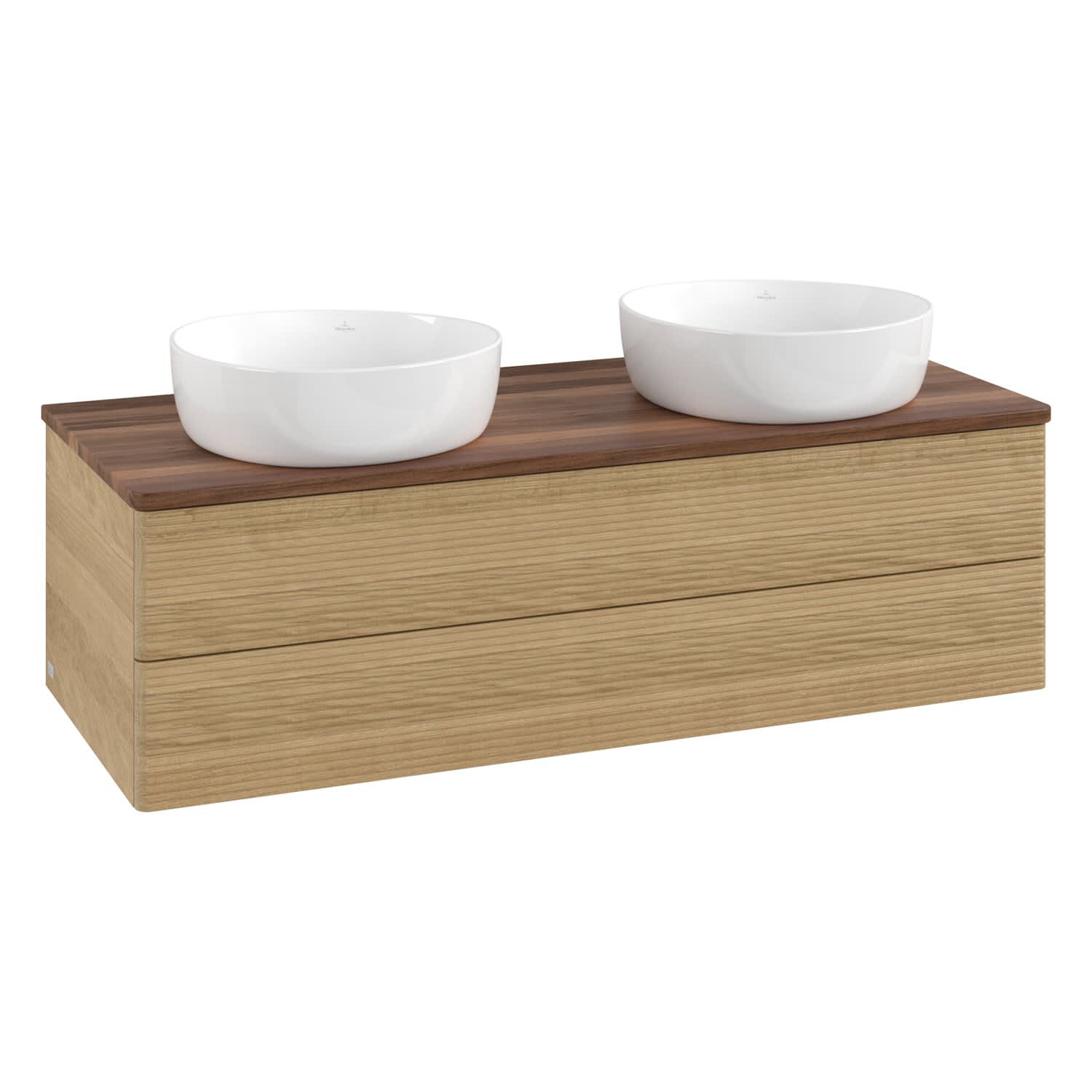 Der wandhängende Antao Waschtischunterschrank von Villeroy & Boch bietet nicht nur jede Menge Stauraum – er ist dank seines naturinspirierten Designs mit seinen abgerundeten Kanten auch noch besonders stilvoll und schafft eine gemütliche Atmosphäre im Badezimmer. Kombiniert mit zwei passenden Aufsatzwaschtischen also die ideale Wahl. Zwei geräumige Auszüge bieten viel Platz, um alles Notwendige zu verstauen und Ordnung zu halten. Öffnen lassen sie sich durch leichten Druck auf die strukturierte Front. Dabei aktiviert sich übrigens die Auszugsbeleuchtung in angenehmem Warmweiß. Dank Vollauszug hat man immer alles im Blick und der Antirutschboden verhindert ein Umfallen oder Verrutschen der Gegenstände. Einfach clever! Für eine besonders leichte Pflege sorgt die mehrschichtig deckend lackierte Oberfläche. Bei der Ausführung in Massivholz wird dank des verarbeiteten Massivholzes jedes Möbel zu einem Unikat, das sich durch das lebendige Naturmaterial durch seine einzigartige Struktur und Maserung auszeichnet.