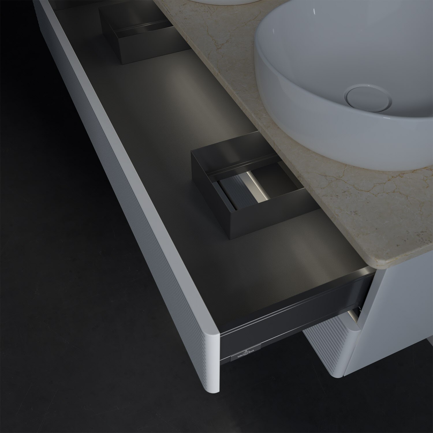 Der wandhängende Antao Waschtischunterschrank von Villeroy & Boch bietet nicht nur jede Menge Stauraum – er ist dank seines naturinspirierten Designs mit seinen abgerundeten Kanten auch noch besonders stilvoll und schafft eine gemütliche Atmosphäre im Badezimmer. Kombiniert mit zwei passenden Aufsatzwaschtischen also die ideale Wahl. Zwei geräumige Auszüge bieten viel Platz, um alles Notwendige zu verstauen und Ordnung zu halten. Öffnen lassen sie sich durch leichten Druck auf die strukturierte Front. Dabei aktiviert sich übrigens die Auszugsbeleuchtung in angenehmem Warmweiß. Dank Vollauszug hat man immer alles im Blick und der Antirutschboden verhindert ein Umfallen oder Verrutschen der Gegenstände. Einfach clever! Für eine besonders leichte Pflege sorgt die mehrschichtig deckend lackierte Oberfläche. Bei der Ausführung in Massivholz wird dank des verarbeiteten Massivholzes jedes Möbel zu einem Unikat, das sich durch das lebendige Naturmaterial durch seine einzigartige Struktur und Maserung auszeichnet.