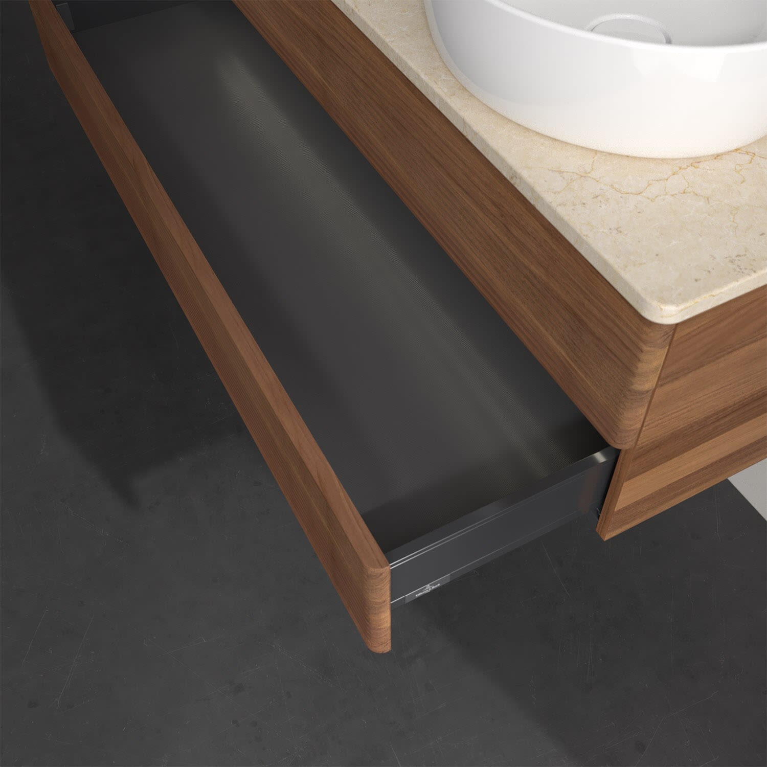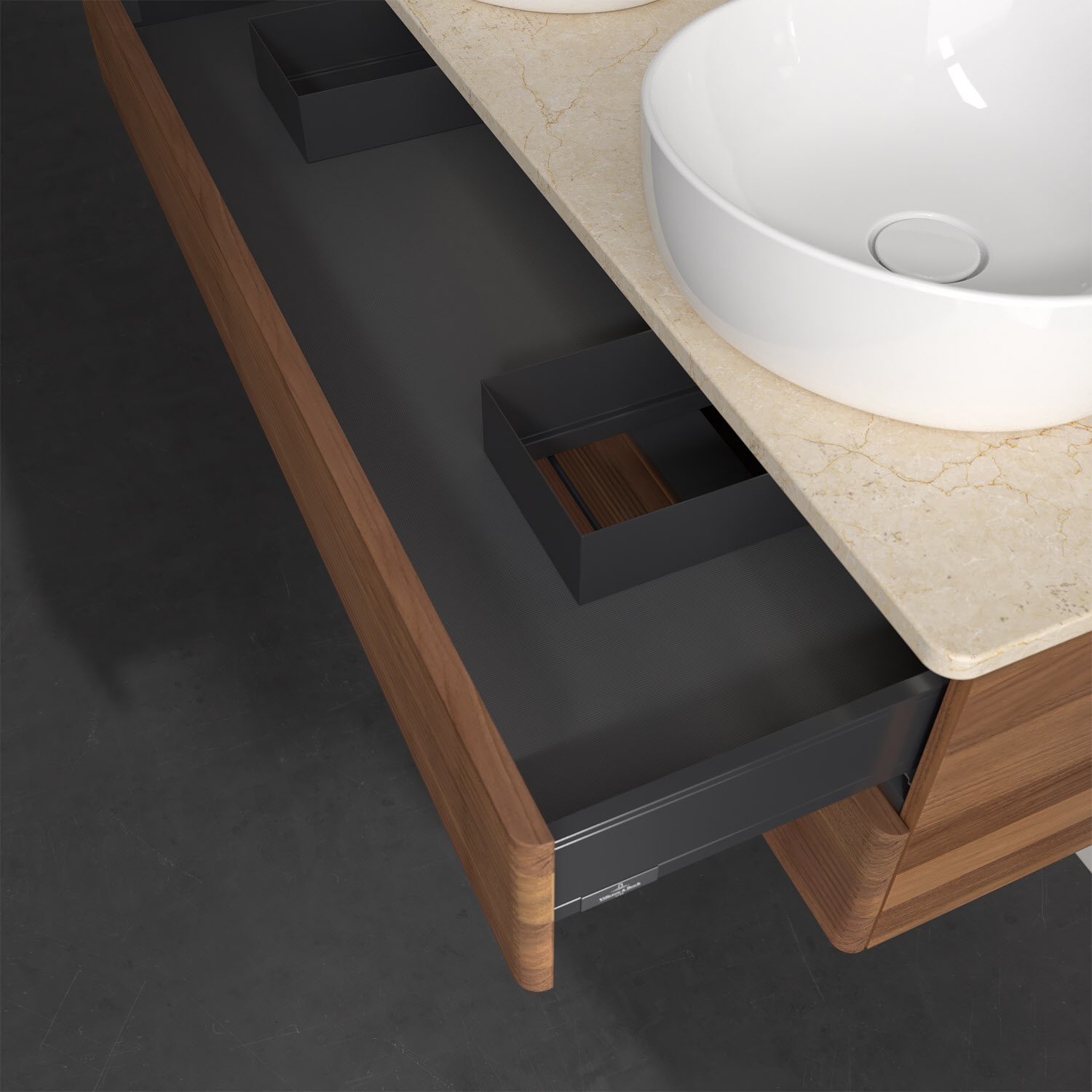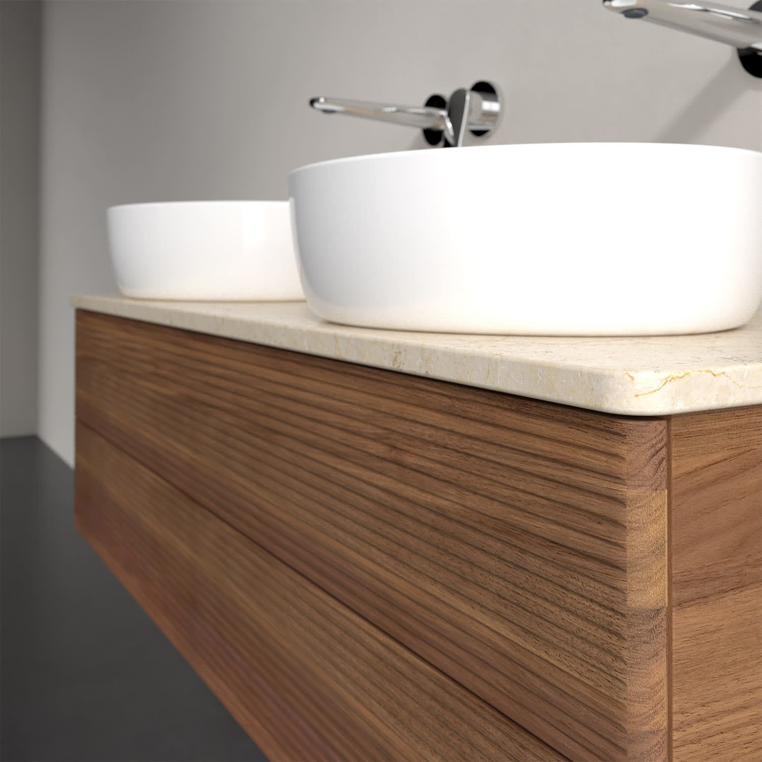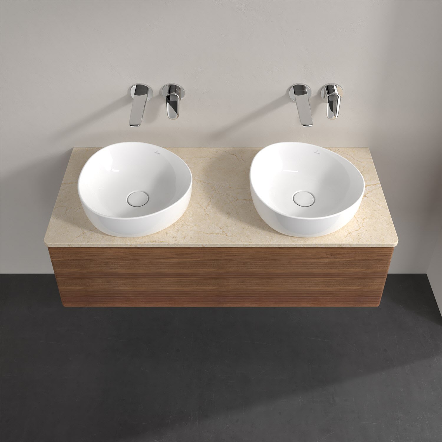Der wandhängende Antao Waschtischunterschrank von Villeroy & Boch bietet nicht nur jede Menge Stauraum – er ist dank seines naturinspirierten Designs mit seinen abgerundeten Kanten auch noch besonders stilvoll und schafft eine gemütliche Atmosphäre im Badezimmer. Kombiniert mit zwei passenden Aufsatzwaschtischen also die ideale Wahl. Zwei geräumige Auszüge bieten viel Platz, um alles Notwendige zu verstauen und Ordnung zu halten. Öffnen lassen sie sich durch leichten Druck auf die strukturierte Front. Dabei aktiviert sich übrigens die Auszugsbeleuchtung in angenehmem Warmweiß. Dank Vollauszug hat man immer alles im Blick und der Antirutschboden verhindert ein Umfallen oder Verrutschen der Gegenstände. Einfach clever! Für eine besonders leichte Pflege sorgt die mehrschichtig deckend lackierte Oberfläche. Bei der Ausführung in Massivholz wird dank des verarbeiteten Massivholzes jedes Möbel zu einem Unikat, das sich durch das lebendige Naturmaterial durch seine einzigartige Struktur und Maserung auszeichnet.