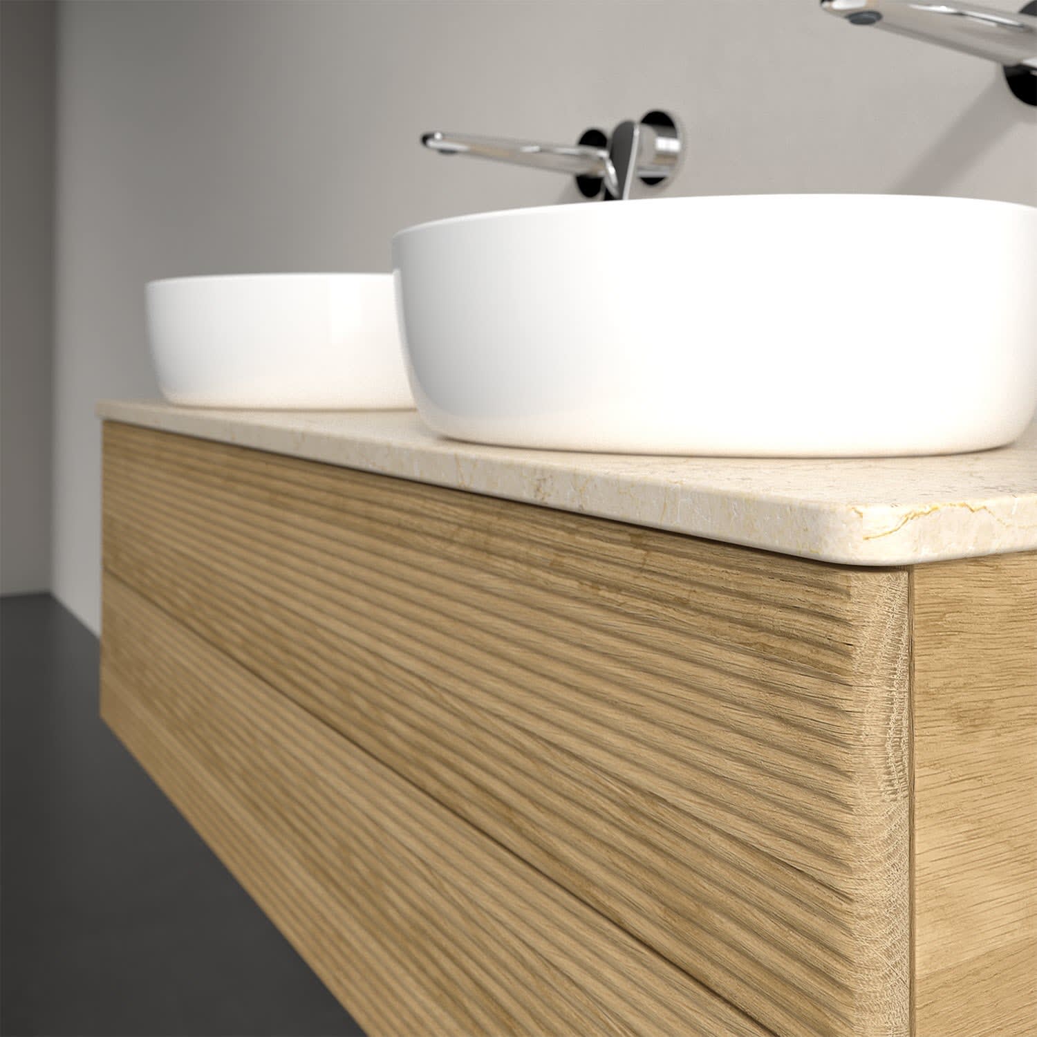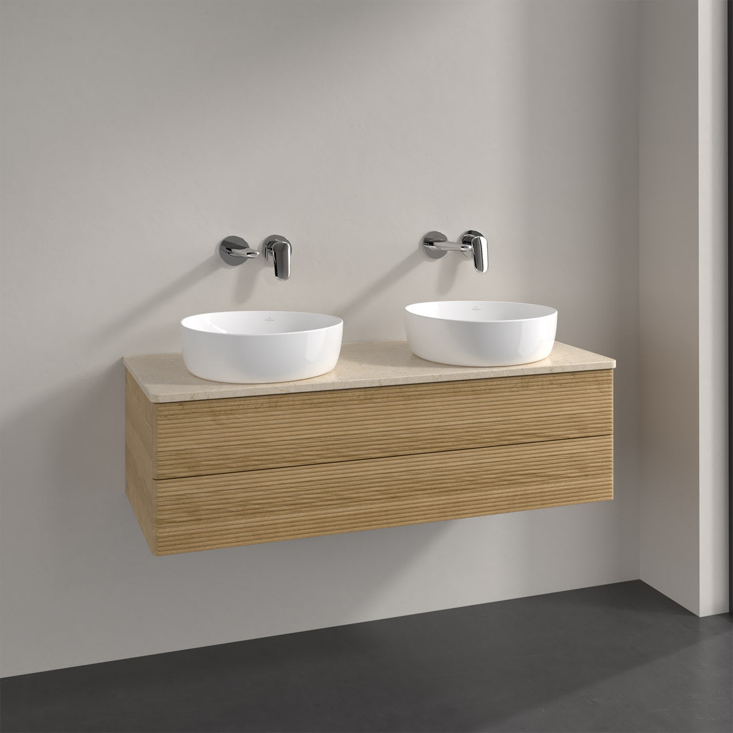 Der wandhängende Antao Waschtischunterschrank von Villeroy & Boch bietet nicht nur jede Menge Stauraum – er ist dank seines naturinspirierten Designs mit seinen abgerundeten Kanten auch noch besonders stilvoll und schafft eine gemütliche Atmosphäre im Badezimmer. Kombiniert mit zwei passenden Aufsatzwaschtischen also die ideale Wahl. Zwei geräumige Auszüge bieten viel Platz, um alles Notwendige zu verstauen und Ordnung zu halten. Öffnen lassen sie sich durch leichten Druck auf die strukturierte Front. Dabei aktiviert sich übrigens die Auszugsbeleuchtung in angenehmem Warmweiß. Dank Vollauszug hat man immer alles im Blick und der Antirutschboden verhindert ein Umfallen oder Verrutschen der Gegenstände. Einfach clever! Für eine besonders leichte Pflege sorgt die mehrschichtig deckend lackierte Oberfläche. Bei der Ausführung in Massivholz wird dank des verarbeiteten Massivholzes jedes Möbel zu einem Unikat, das sich durch das lebendige Naturmaterial durch seine einzigartige Struktur und Maserung auszeichnet.