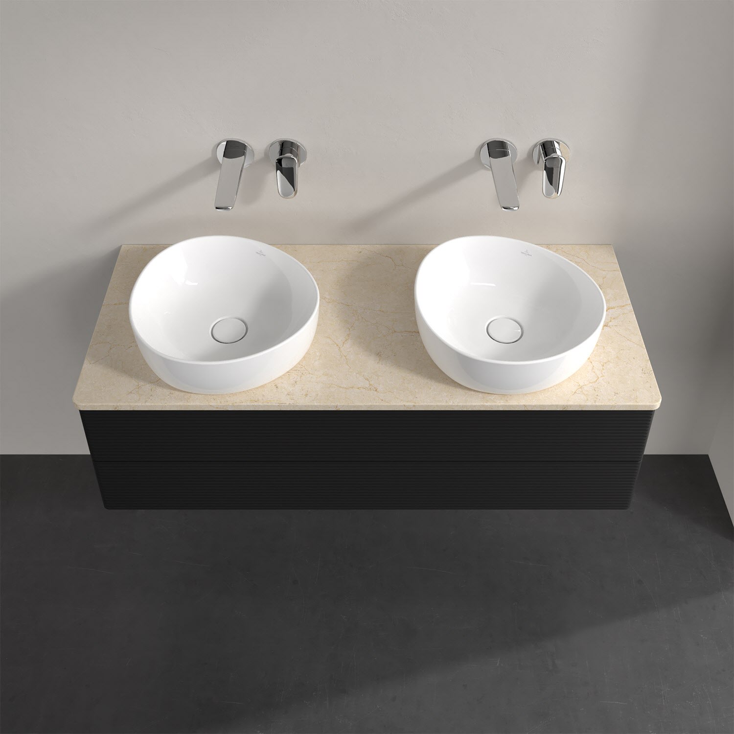 Der wandhängende Antao Waschtischunterschrank von Villeroy & Boch bietet nicht nur jede Menge Stauraum – er ist dank seines naturinspirierten Designs mit seinen abgerundeten Kanten auch noch besonders stilvoll und schafft eine gemütliche Atmosphäre im Badezimmer. Kombiniert mit zwei passenden Aufsatzwaschtischen also die ideale Wahl. Zwei geräumige Auszüge bieten viel Platz, um alles Notwendige zu verstauen und Ordnung zu halten. Öffnen lassen sie sich durch leichten Druck auf die strukturierte Front. Dabei aktiviert sich übrigens die Auszugsbeleuchtung in angenehmem Warmweiß. Dank Vollauszug hat man immer alles im Blick und der Antirutschboden verhindert ein Umfallen oder Verrutschen der Gegenstände. Einfach clever! Für eine besonders leichte Pflege sorgt die mehrschichtig deckend lackierte Oberfläche. Bei der Ausführung in Massivholz wird dank des verarbeiteten Massivholzes jedes Möbel zu einem Unikat, das sich durch das lebendige Naturmaterial durch seine einzigartige Struktur und Maserung auszeichnet.