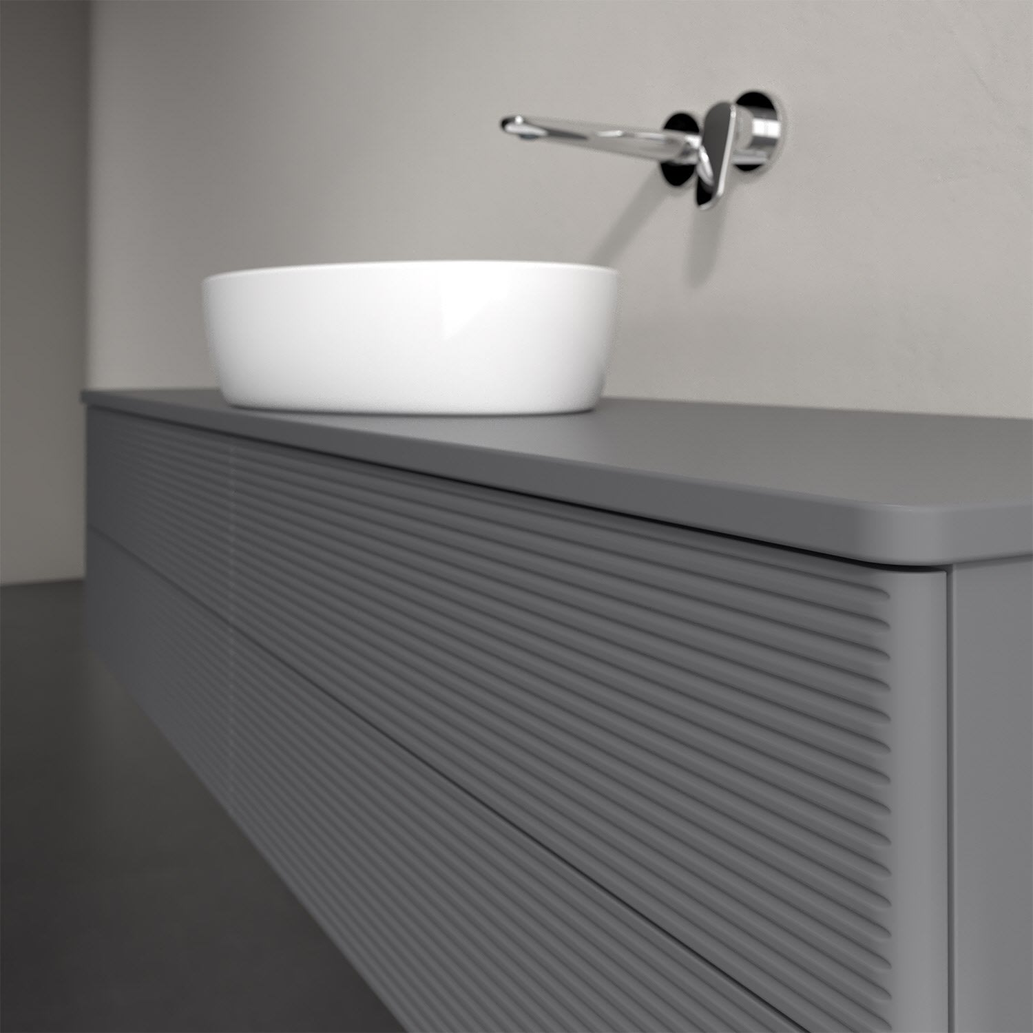 Der wandhängende Antao Waschtischunterschrank bietet mit seinen vier Auszügen und seiner erstaunlichen Größe viel Platz zum Verstauen von Utensilien im Badezimmer. Dank des mittig platzierten Aufsatzwaschtischs gibt es seitlich weiteren Platz für Handtücher, Seifenspender & Co. auf der Waschtischplatte. Inspiriert von der Natur überzeugt der Unterschrank auch optisch mit sanfter Formsprache und abgerundete Kanten. Die grifflosen Auszüge mit strukturierter Front sind mit der Push-to-Open Funktion ausgestattet und verfügen über einen Antirutschboden, damit Utensilien sicher verstaut werden können. Den Überblick behält man dank der warmweißen Auszugsbeleuchtung, die sich automatisch beim Öffnen einschaltet. Mit seiner Vollauszug- und Selbsteinzug-Funktion ist der Schrank einfach praktisch und leicht zu bedienen. Qualität von Villeroy & Boch! Für eine besonders leichte Pflege sorgt die mehrschichtig deckend lackierte Oberfläche.