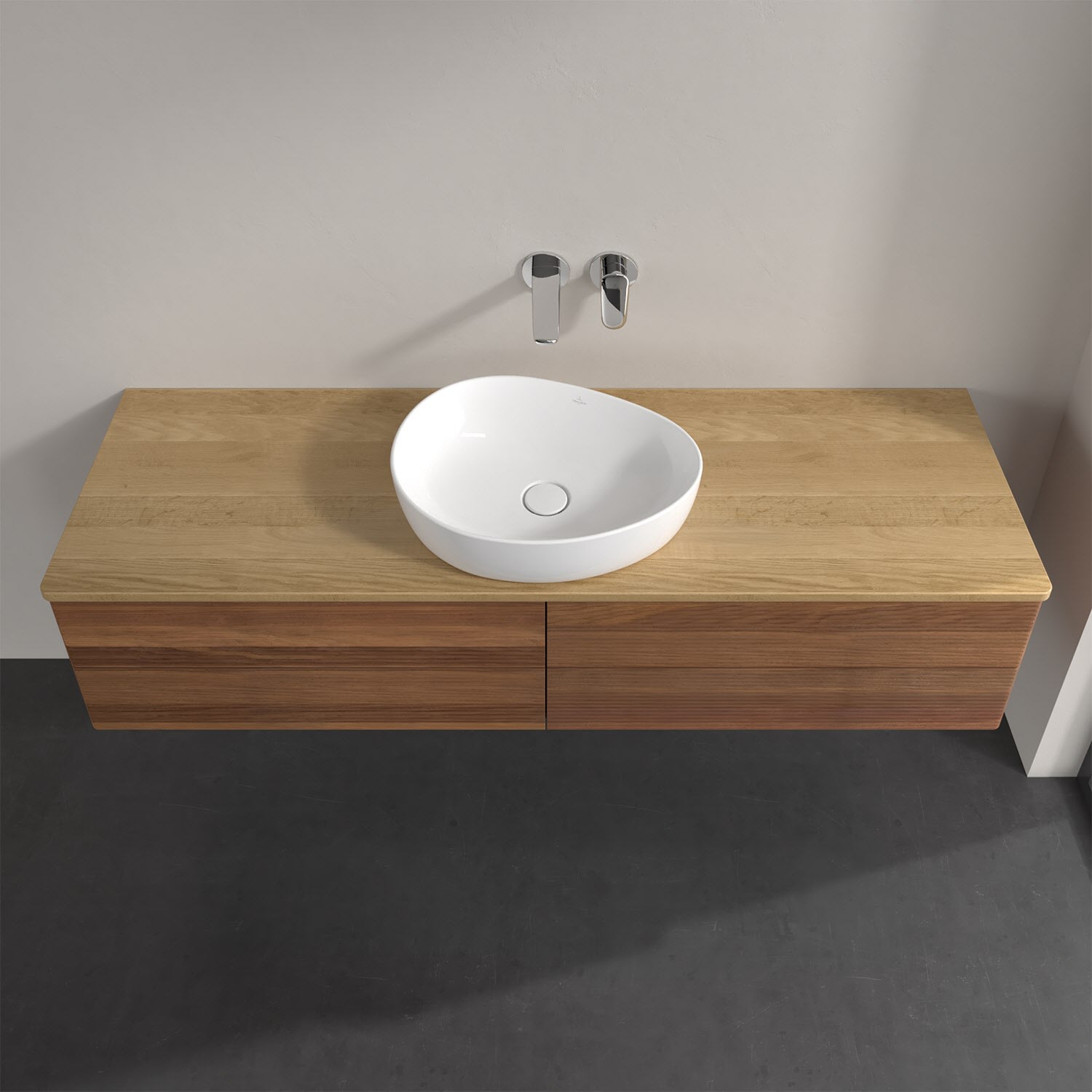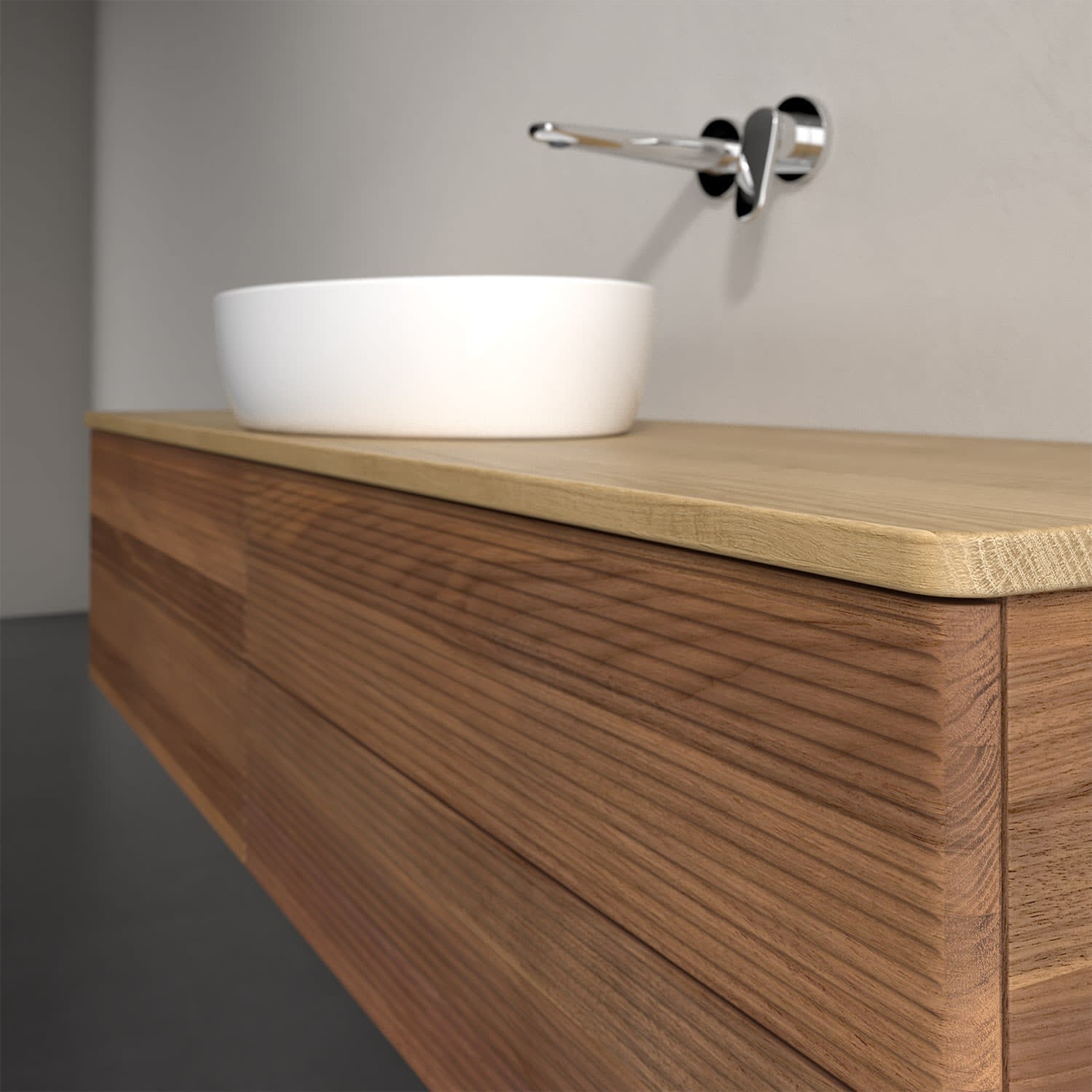 Der wandhängende Antao Waschtischunterschrank bietet mit seinen vier Auszügen und seiner erstaunlichen Größe viel Platz zum Verstauen von Utensilien im Badezimmer. Dank des mittig platzierten Aufsatzwaschtischs gibt es seitlich weiteren Platz für Handtücher, Seifenspender & Co. auf der Waschtischplatte. Inspiriert von der Natur überzeugt der Unterschrank auch optisch mit sanfter Formsprache und abgerundete Kanten. Die grifflosen Auszüge mit strukturierter Front sind mit der Push-to-Open Funktion ausgestattet und verfügen über einen Antirutschboden, damit Utensilien sicher verstaut werden können. Den Überblick behält man dank der warmweißen Auszugsbeleuchtung, die sich automatisch beim Öffnen einschaltet. Mit seiner Vollauszug- und Selbsteinzug-Funktion ist der Schrank einfach praktisch und leicht zu bedienen. Qualität von Villeroy & Boch! Für eine besonders leichte Pflege sorgt die mehrschichtig deckend lackierte Oberfläche. Bei der Ausführung in Massivholz wird dank des verarbeiteten Massivholzes jedes Möbel zu einem Unikat, das sich durch das lebendige Naturmaterial durch seine einzigartige Struktur und Maserung auszeichnet.