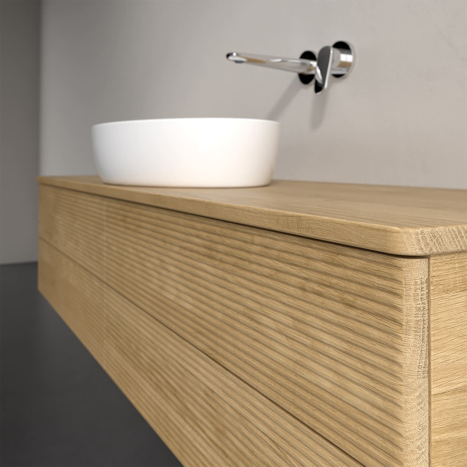 Der wandhängende Antao Waschtischunterschrank bietet mit seinen vier Auszügen und seiner erstaunlichen Größe viel Platz zum Verstauen von Utensilien im Badezimmer. Dank des mittig platzierten Aufsatzwaschtischs gibt es seitlich weiteren Platz für Handtücher, Seifenspender & Co. auf der Waschtischplatte. Inspiriert von der Natur überzeugt der Unterschrank auch optisch mit sanfter Formsprache und abgerundete Kanten. Die grifflosen Auszüge mit strukturierter Front sind mit der Push-to-Open Funktion ausgestattet und verfügen über einen Antirutschboden, damit Utensilien sicher verstaut werden können. Den Überblick behält man dank der warmweißen Auszugsbeleuchtung, die sich automatisch beim Öffnen einschaltet. Mit seiner Vollauszug- und Selbsteinzug-Funktion ist der Schrank einfach praktisch und leicht zu bedienen. Qualität von Villeroy & Boch! Für eine besonders leichte Pflege sorgt die mehrschichtig deckend lackierte Oberfläche. Bei der Ausführung in Massivholz wird dank des verarbeiteten Massivholzes jedes Möbel zu einem Unikat, das sich durch das lebendige Naturmaterial durch seine einzigartige Struktur und Maserung auszeichnet.
