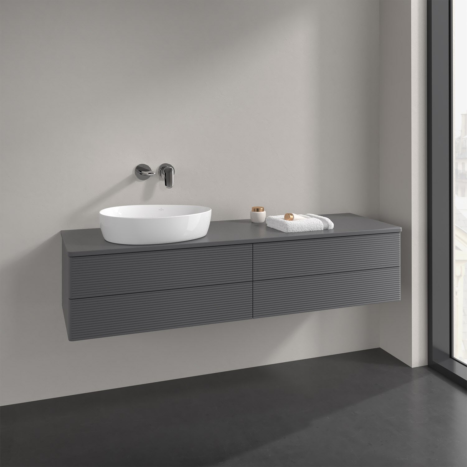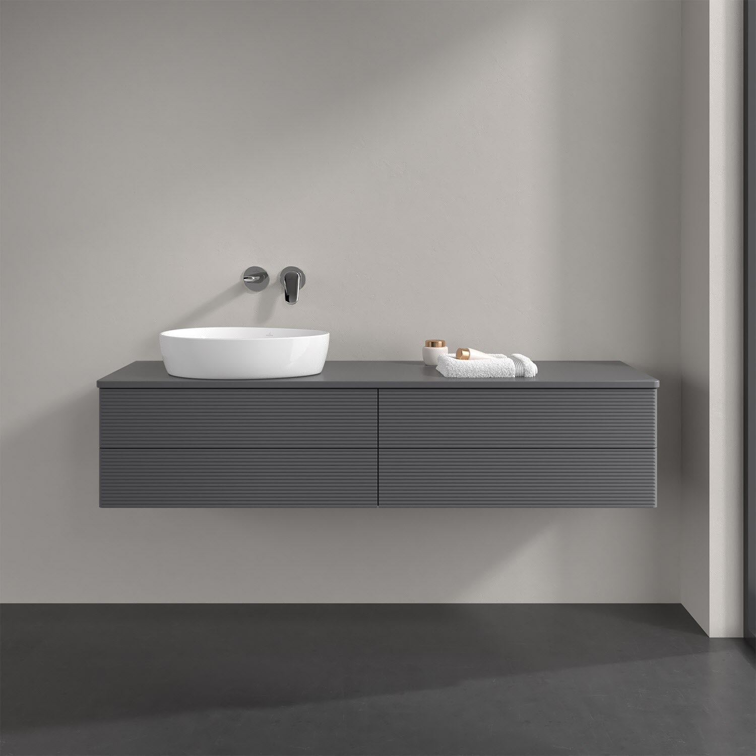 Villeroy & Boch Antao Waschbeckenunterschrank, 160 x 36 cm, 4 Auszüge mit LED-Licht, Front mit Struktur, ohne Hahnloch, für Waschtisch links