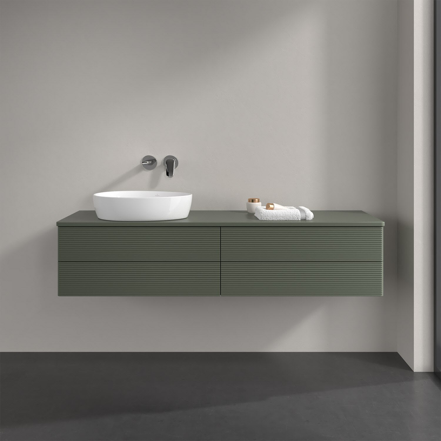 Der wandhängende Antao Waschtischunterschrank bietet mit seinen vier Auszügen und seiner erstaunlichen Größe viel Platz zum Verstauen von Utensilien im Badezimmer. Dank des seitlich platzierten Aufsatzwaschtischs gibt es daneben weiteren Platz für Handtücher, Seifenspender & Co. auf der Waschtischplatte. Inspiriert von der Natur überzeugt der Unterschrank auch optisch mit sanfter Formsprache und abgerundete Kanten. Die grifflosen Auszüge mit strukturierter Front sind mit der Push-to-Open Funktion ausgestattet und verfügen über einen Antirutschboden, damit Utensilien sicher verstaut werden können. Den Überblick behält man dank der warmweißen Auszugsbeleuchtung, die sich automatisch beim Öffnen einschaltet. Mit seiner Vollauszug- und Selbsteinzug-Funktion ist der Schrank einfach praktisch und leicht zu bedienen. Qualität von Villeroy & Boch! Für eine besonders leichte Pflege sorgt die mehrschichtig deckend lackierte Oberfläche.