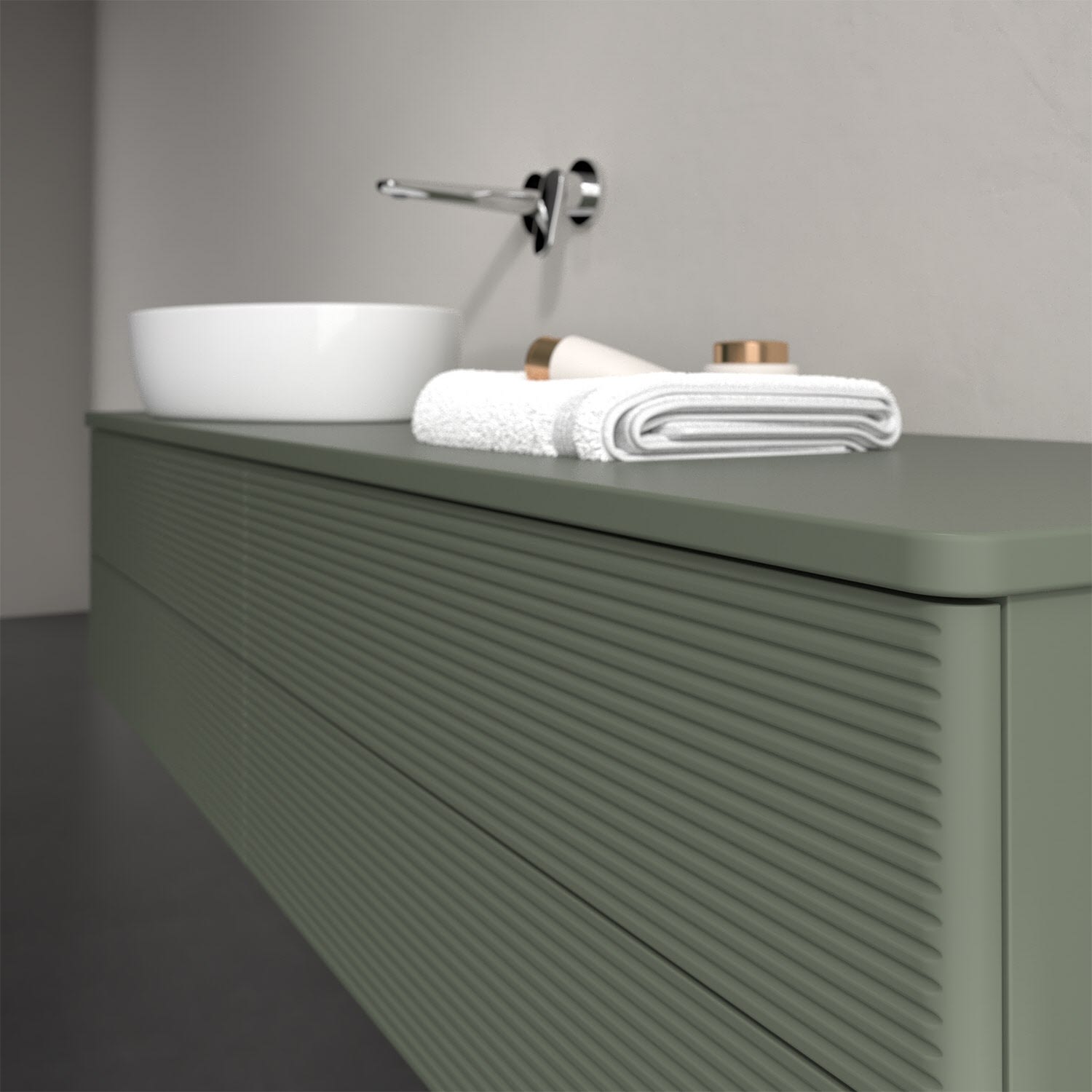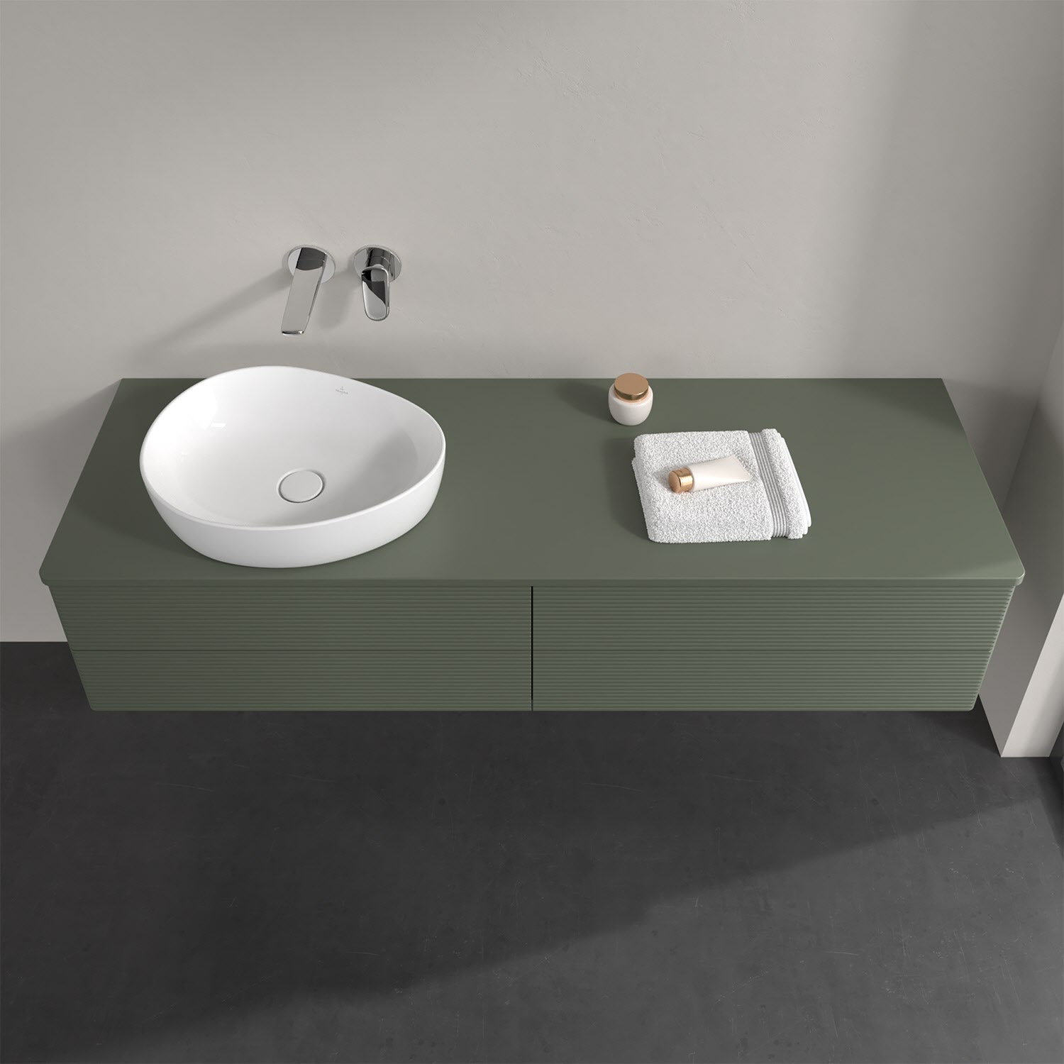Für diesen Waschbeckenunterschrank stehen Ihnen Aufsatzwaschtische aus verschiedenen Serien zur Verfügung (siehe "Passliste" unter Downloads). Ein ausgewähltes Beispiel finden Sie im Zubehör. Den Waschtisch bitte separat mitbestellen.