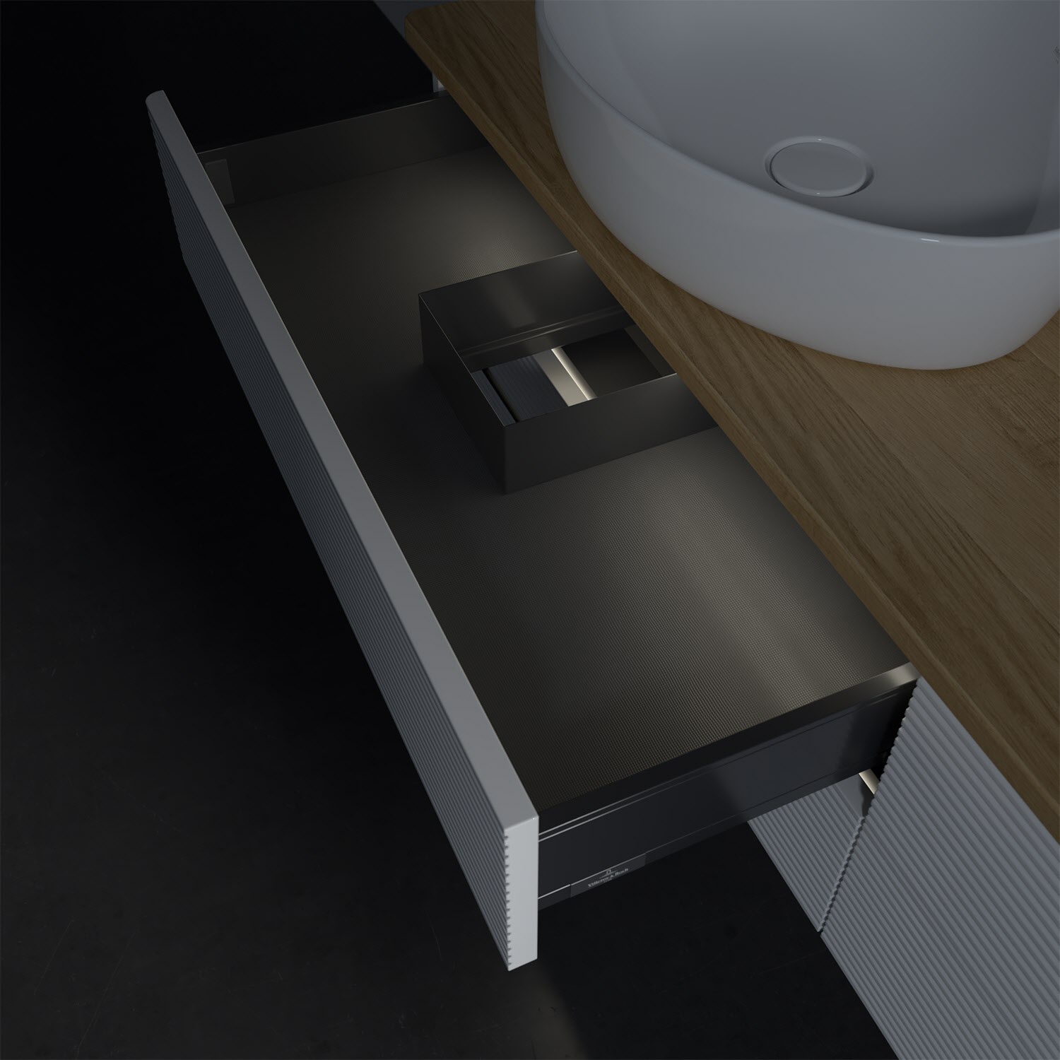 Villeroy & Boch Antao Waschbeckenunterschrank, 160 x 36 cm, 4 Auszüge mit LED-Licht, Front mit Struktur, ohne Hahnloch, für Waschtisch links