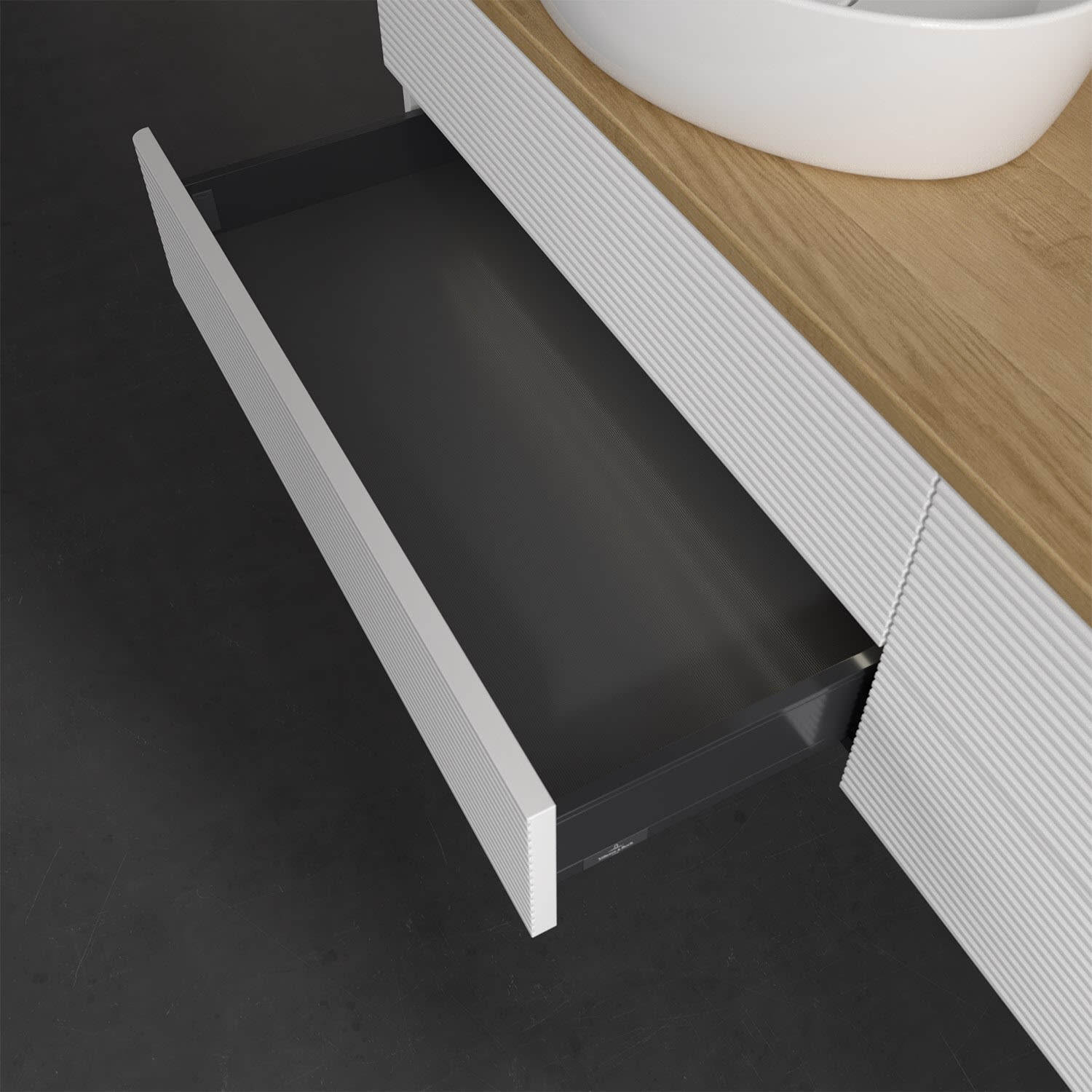 Villeroy & Boch Antao Waschbeckenunterschrank, 160 x 36 cm, 4 Auszüge mit LED-Licht, Front mit Struktur, ohne Hahnloch, für Waschtisch links