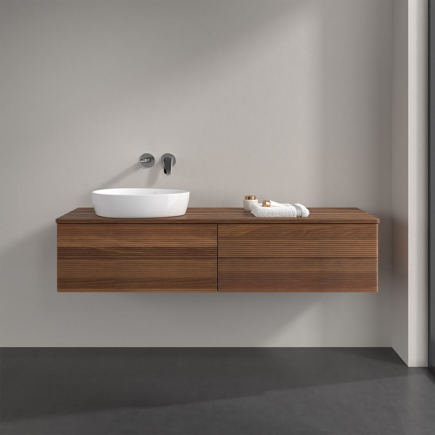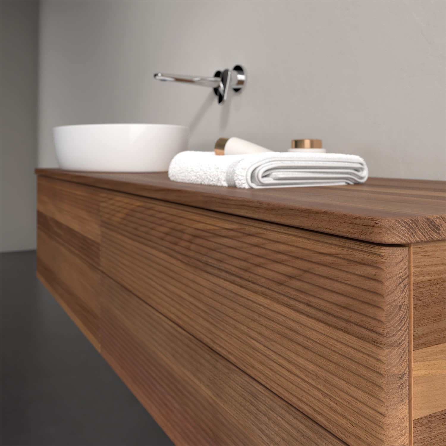 Der wandhängende Antao Waschtischunterschrank bietet mit seinen vier Auszügen und seiner erstaunlichen Größe viel Platz zum Verstauen von Utensilien im Badezimmer. Dank des seitlich platzierten Aufsatzwaschtischs gibt es daneben weiteren Platz für Handtücher, Seifenspender & Co. auf der Waschtischplatte. Inspiriert von der Natur überzeugt der Unterschrank auch optisch mit sanfter Formsprache und abgerundete Kanten. Die grifflosen Auszüge mit strukturierter Front sind mit der Push-to-Open Funktion ausgestattet und verfügen über einen Antirutschboden, damit Utensilien sicher verstaut werden können. Den Überblick behält man dank der warmweißen Auszugsbeleuchtung, die sich automatisch beim Öffnen einschaltet. Mit seiner Vollauszug- und Selbsteinzug-Funktion ist der Schrank einfach praktisch und leicht zu bedienen. Qualität von Villeroy & Boch! Für eine besonders leichte Pflege sorgt die mehrschichtig deckend lackierte Oberfläche. Bei der Ausführung in Massivholz wird dank des verarbeiteten Massivholzes jedes Möbel zu einem Unikat, das sich durch das lebendige Naturmaterial durch seine einzigartige Struktur und Maserung auszeichnet.
