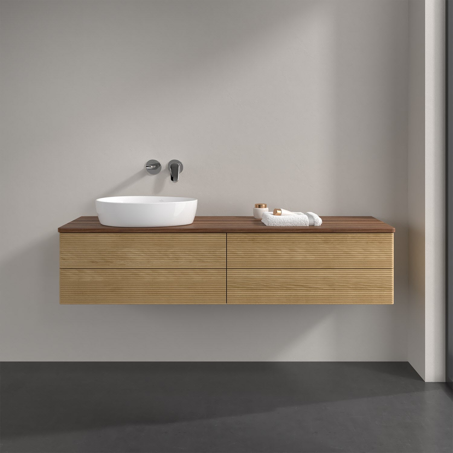 Villeroy & Boch Antao Waschbeckenunterschrank, 160 x 36 cm, 4 Auszüge mit LED-Licht, Front mit Struktur, ohne Hahnloch, für Waschtisch links