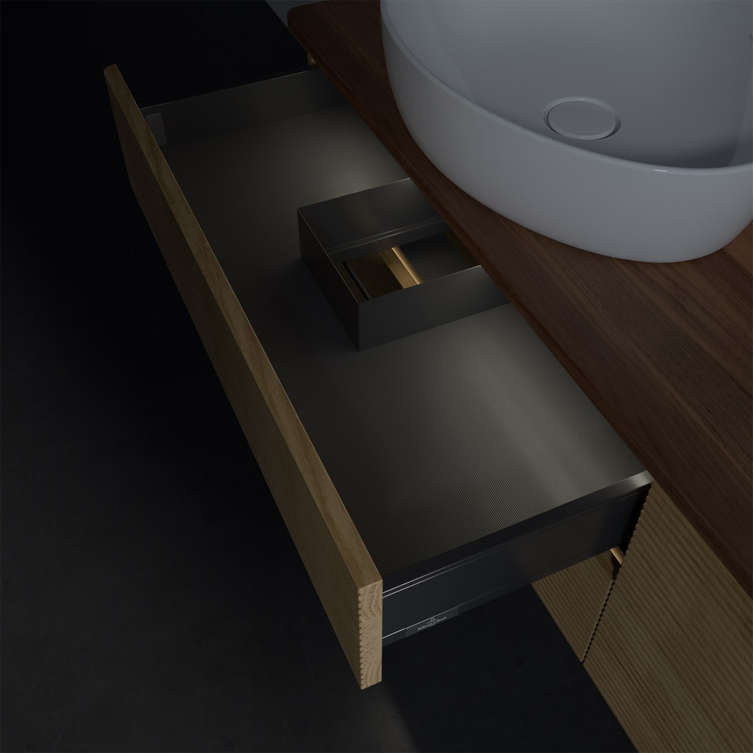 - in Schublade integrierte LED-Leiste mit warmweißem Licht zur Beleuchtung des Innenlebens