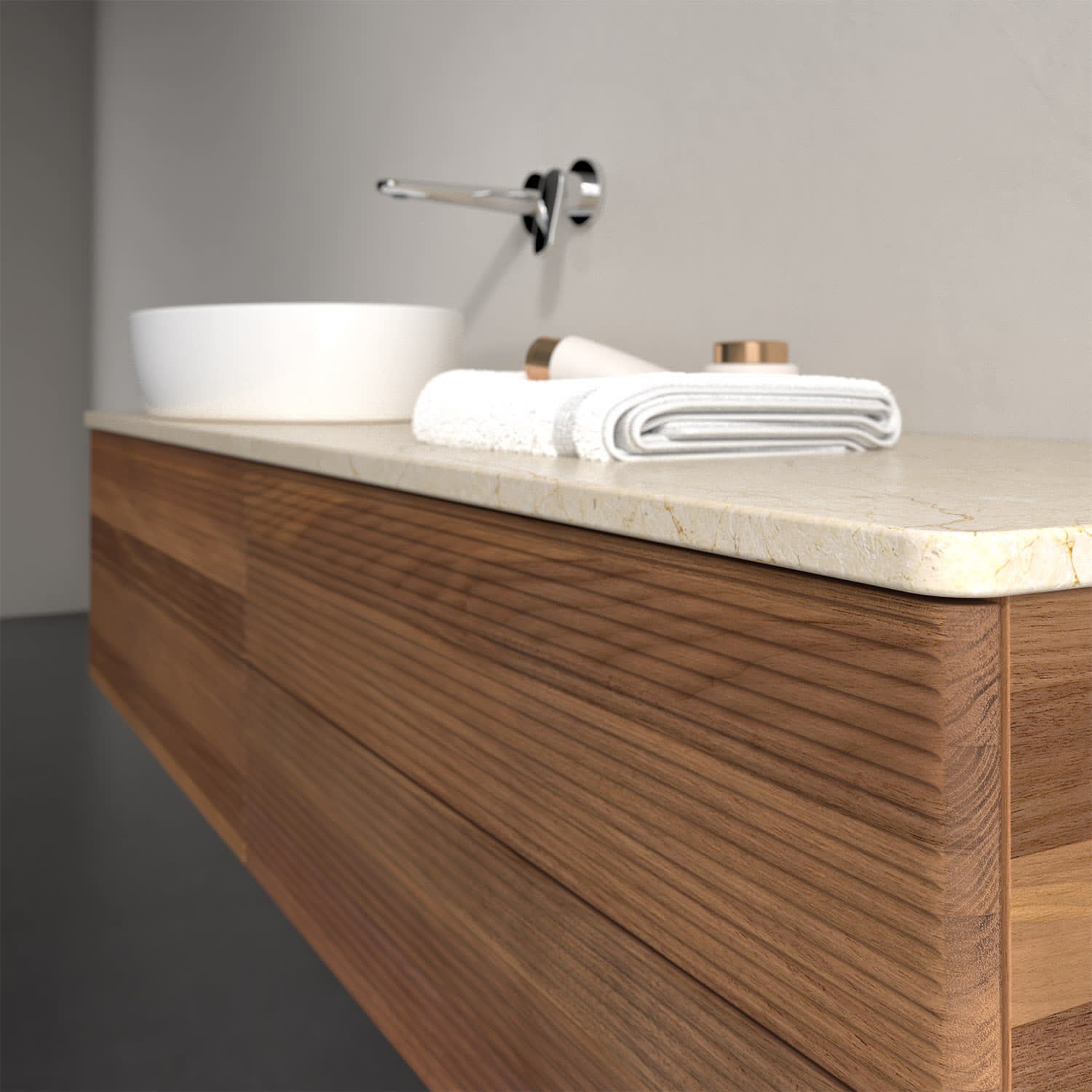 Der wandhängende Antao Waschtischunterschrank bietet mit seinen vier Auszügen und seiner erstaunlichen Größe viel Platz zum Verstauen von Utensilien im Badezimmer. Dank des seitlich platzierten Aufsatzwaschtischs gibt es daneben weiteren Platz für Handtücher, Seifenspender & Co. auf der Waschtischplatte. Inspiriert von der Natur überzeugt der Unterschrank auch optisch mit sanfter Formsprache und abgerundete Kanten. Die grifflosen Auszüge mit strukturierter Front sind mit der Push-to-Open Funktion ausgestattet und verfügen über einen Antirutschboden, damit Utensilien sicher verstaut werden können. Den Überblick behält man dank der warmweißen Auszugsbeleuchtung, die sich automatisch beim Öffnen einschaltet. Mit seiner Vollauszug- und Selbsteinzug-Funktion ist der Schrank einfach praktisch und leicht zu bedienen. Qualität von Villeroy & Boch! Für eine besonders leichte Pflege sorgt die mehrschichtig deckend lackierte Oberfläche. Bei der Ausführung in Massivholz wird dank des verarbeiteten Massivholzes jedes Möbel zu einem Unikat, das sich durch das lebendige Naturmaterial durch seine einzigartige Struktur und Maserung auszeichnet.