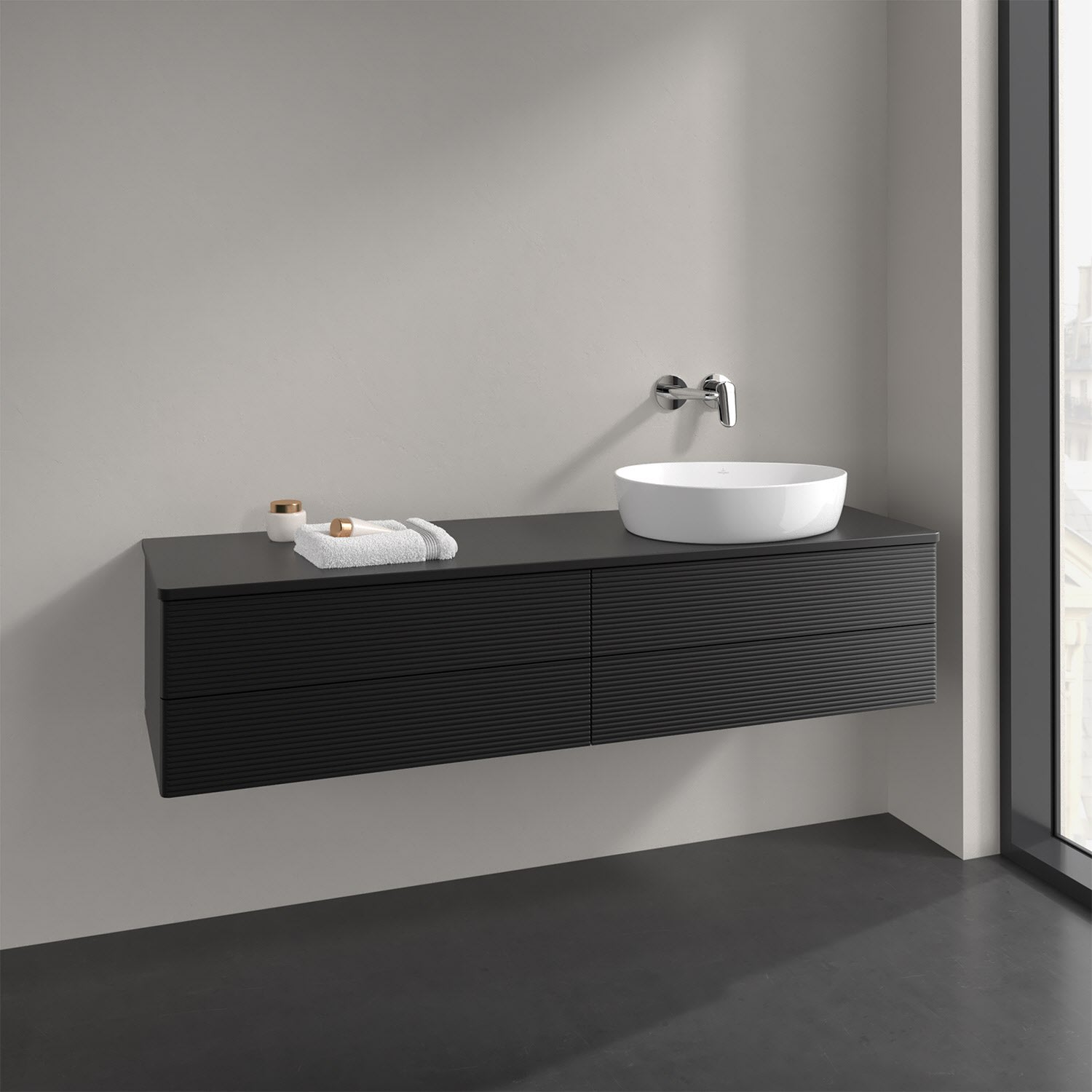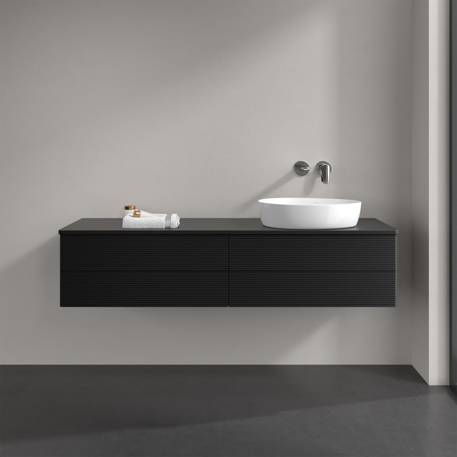 Villeroy & Boch Antao Waschbeckenunterschrank, 160 x 36 cm, 4 Auszüge mit LED-Licht, Front mit Struktur, ohne Hahnloch, für Waschtisch rechts