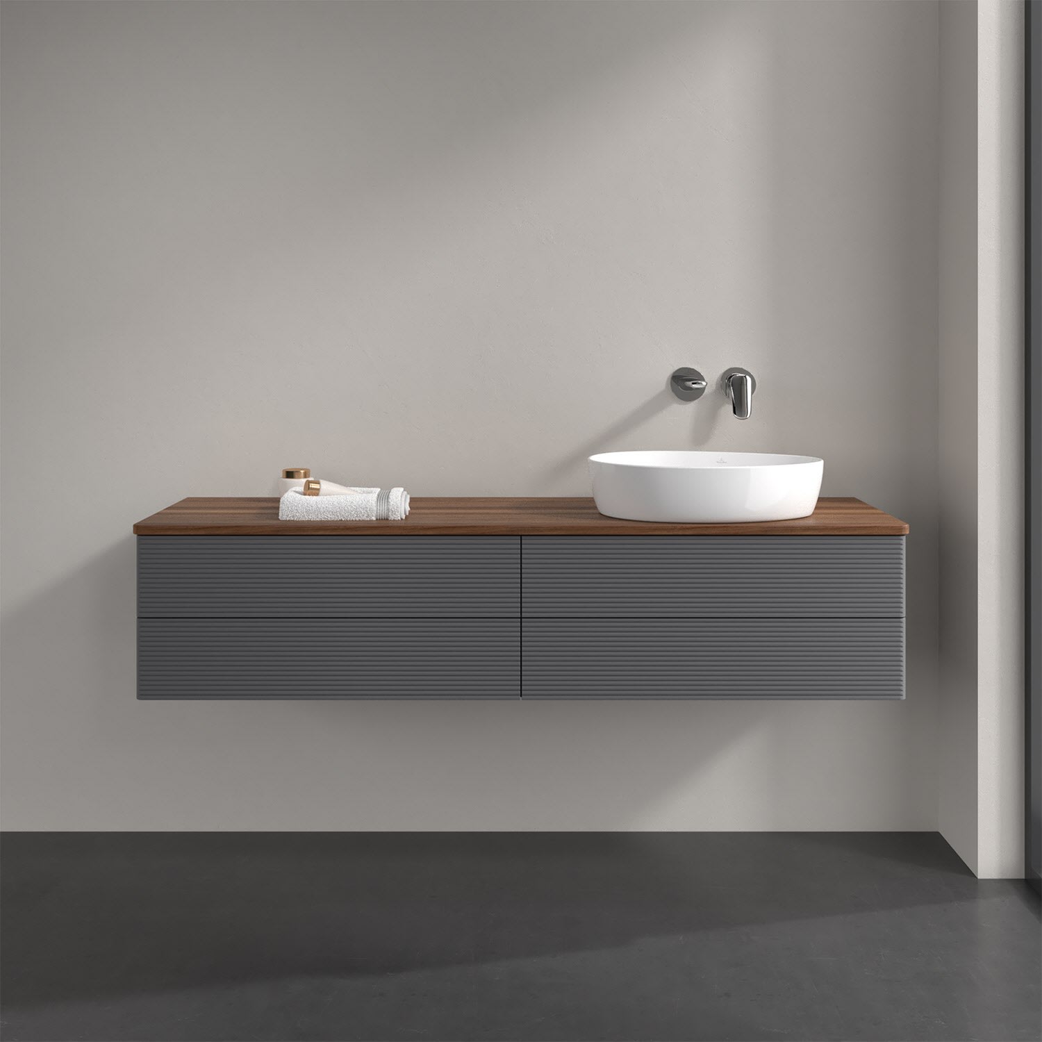 Villeroy & Boch Antao Waschbeckenunterschrank, 160 x 36 cm, 4 Auszüge mit LED-Licht, Front mit Struktur, ohne Hahnloch, für Waschtisch rechts