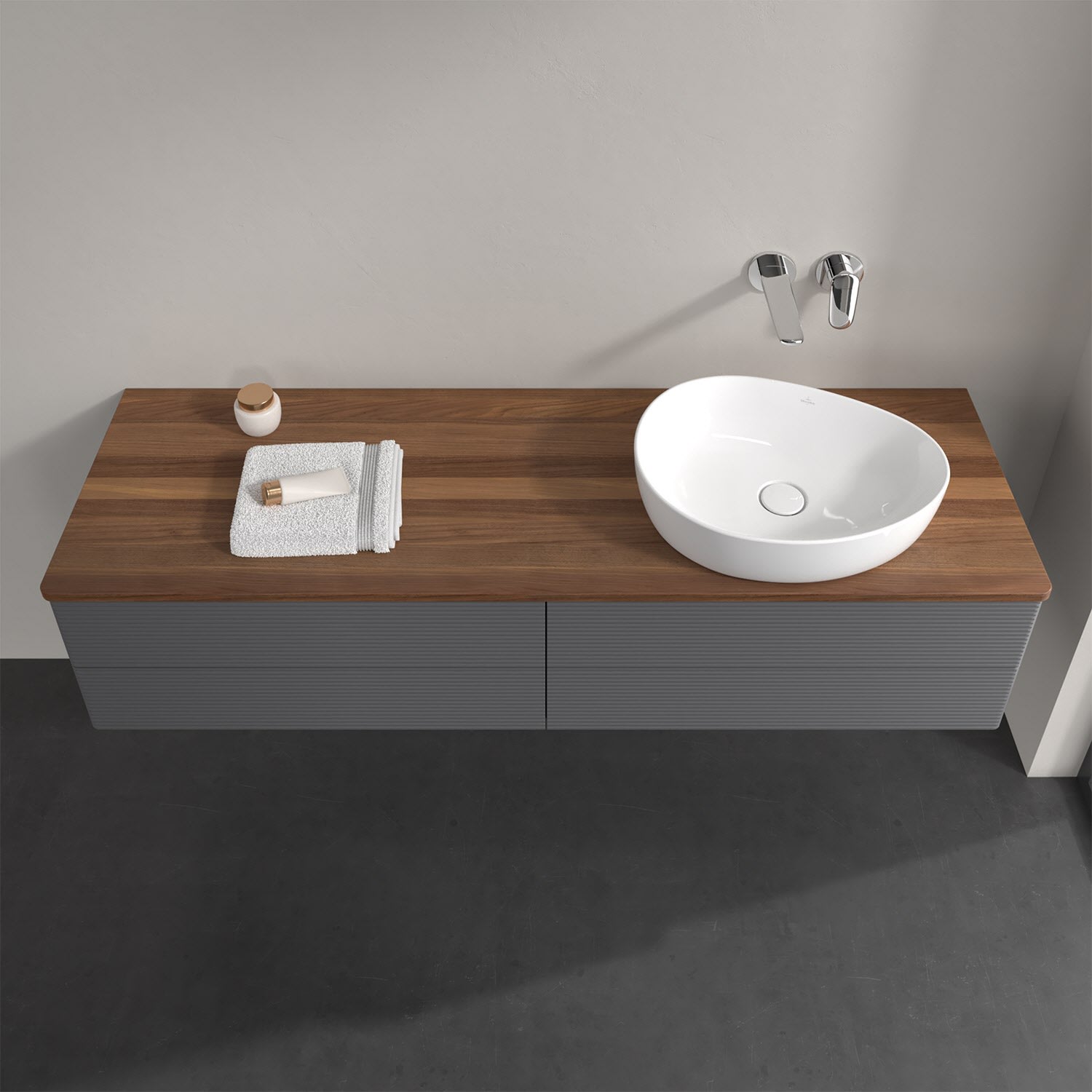 Für diesen Waschbeckenunterschrank stehen Ihnen Aufsatzwaschtische aus verschiedenen Serien zur Verfügung (siehe "Passliste" unter Downloads). Ein ausgewähltes Beispiel finden Sie im Zubehör. Den Waschtisch bitte separat mitbestellen.