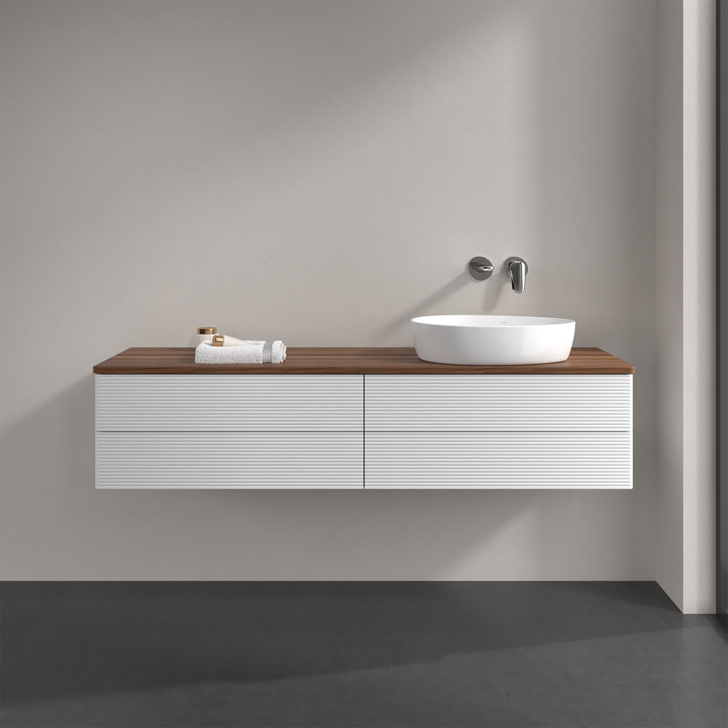 Villeroy & Boch Antao Waschbeckenunterschrank, 160 x 36 cm, 4 Auszüge mit LED-Licht, Front mit Struktur, ohne Hahnloch, für Waschtisch rechts
