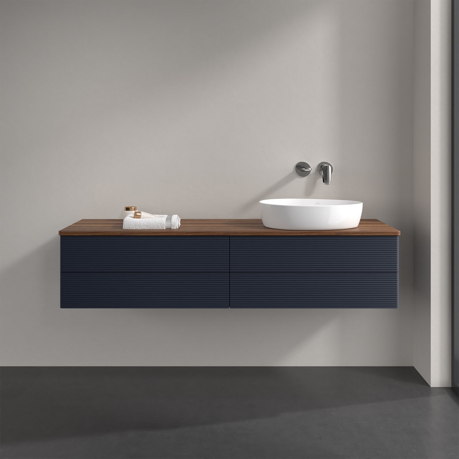 Villeroy & Boch Antao Waschbeckenunterschrank, 160 x 36 cm, 4 Auszüge mit LED-Licht, Front mit Struktur, ohne Hahnloch, für Waschtisch rechts