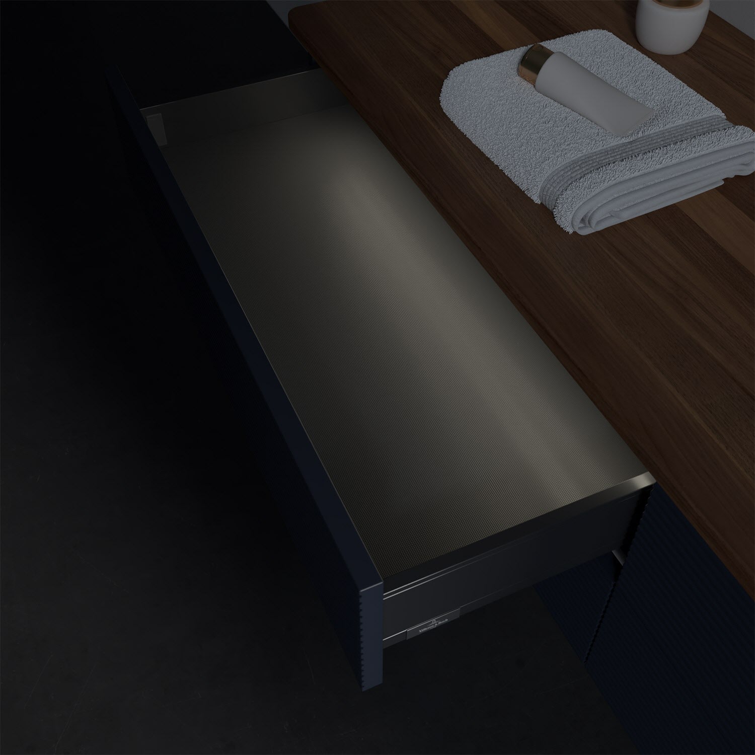 - in Schublade integrierte LED-Leiste mit warmweißem Licht zur Beleuchtung des Innenlebens