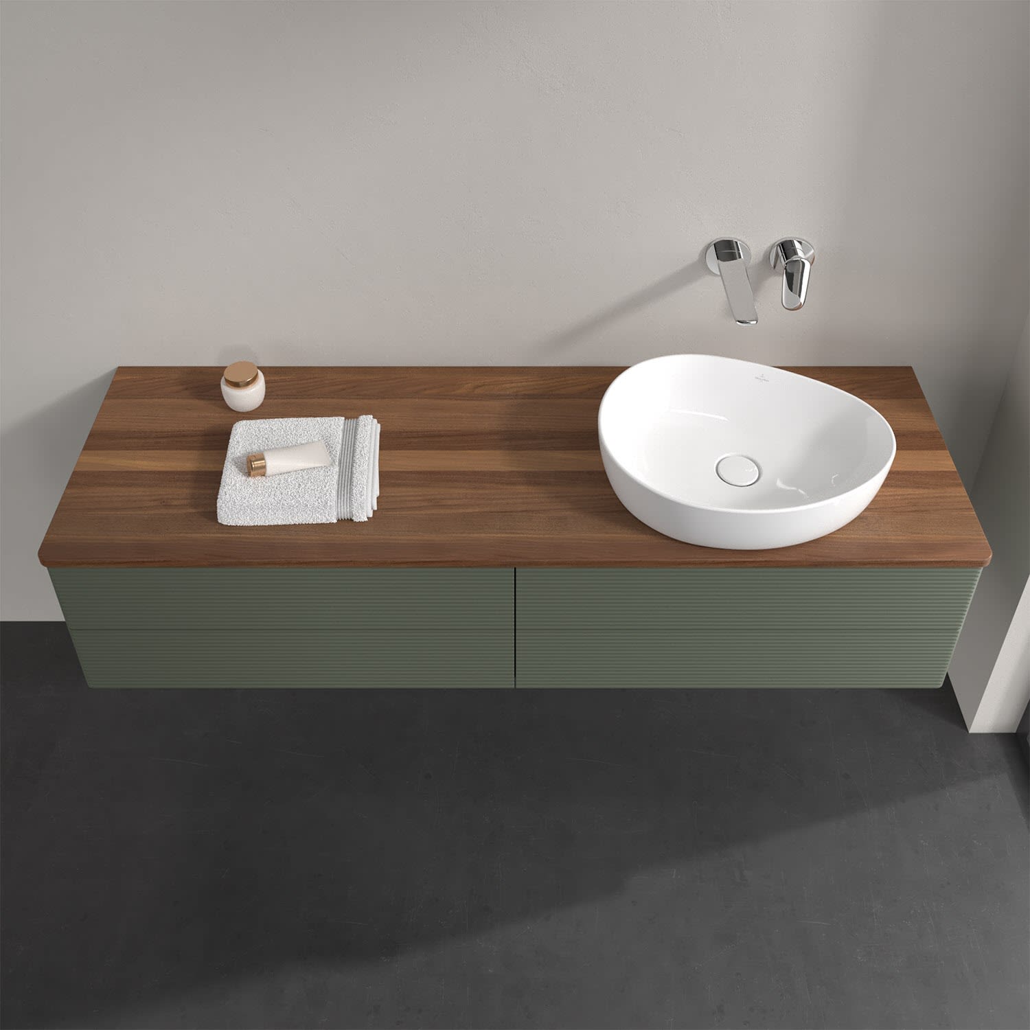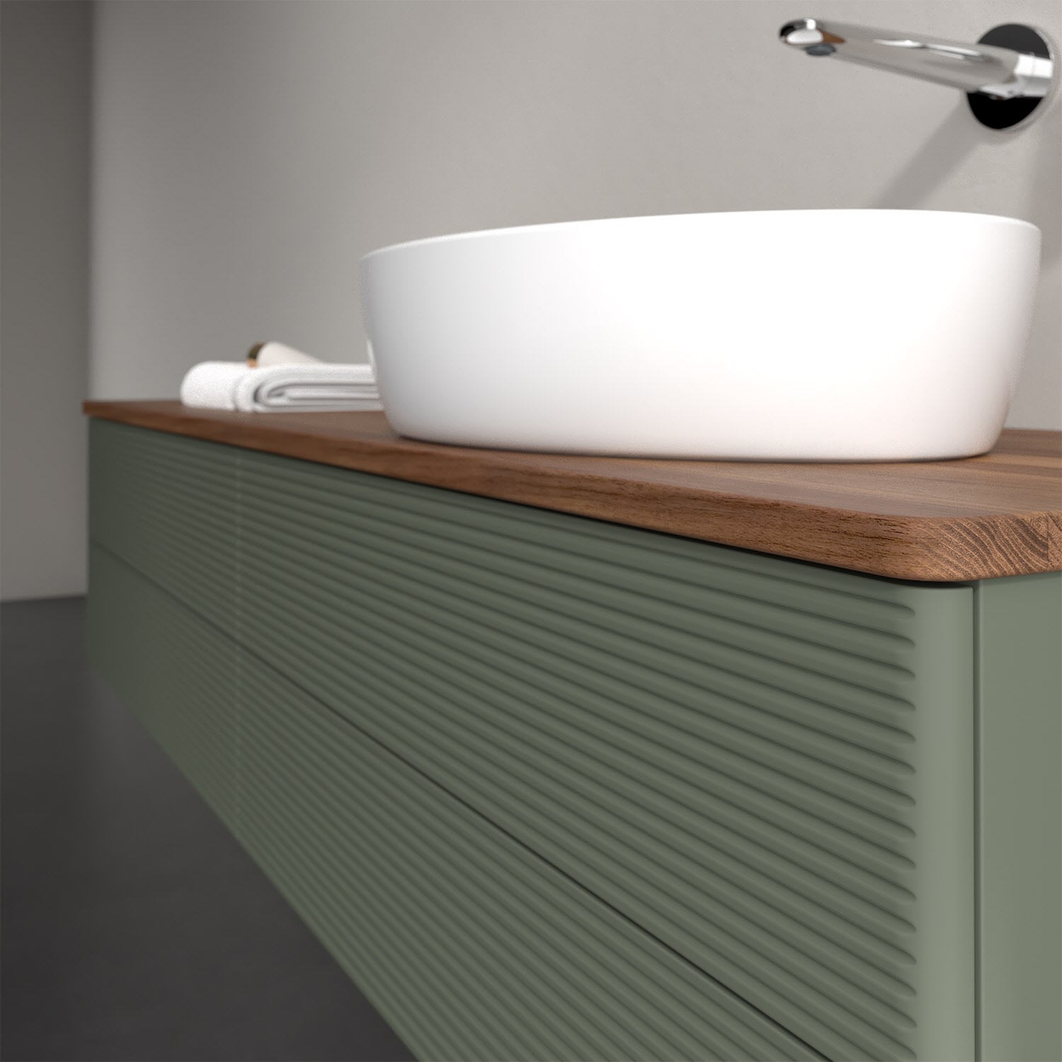 Der wandhängende Antao Waschtischunterschrank bietet mit seinen vier Auszügen und seiner erstaunlichen Größe viel Platz zum Verstauen von Utensilien im Badezimmer. Dank des seitlich platzierten Aufsatzwaschtischs gibt es daneben weiteren Platz für Handtücher, Seifenspender & Co. auf der Waschtischplatte. Inspiriert von der Natur überzeugt der Unterschrank auch optisch mit sanfter Formsprache und abgerundete Kanten. Die grifflosen Auszüge mit strukturierter Front sind mit der Push-to-Open Funktion ausgestattet und verfügen über einen Antirutschboden, damit Utensilien sicher verstaut werden können. Den Überblick behält man dank der warmweißen Auszugsbeleuchtung, die sich automatisch beim Öffnen einschaltet. Mit seiner Vollauszug- und Selbsteinzug-Funktion ist der Schrank einfach praktisch und leicht zu bedienen. Qualität von Villeroy & Boch! Für eine besonders leichte Pflege sorgt die mehrschichtig deckend lackierte Oberfläche. Bei der Ausführung in Massivholz wird dank des verarbeiteten Massivholzes jedes Möbel zu einem Unikat, das sich durch das lebendige Naturmaterial durch seine einzigartige Struktur und Maserung auszeichnet.