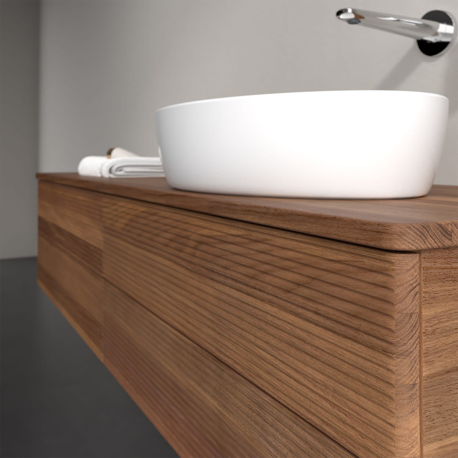 Der wandhängende Antao Waschtischunterschrank bietet mit seinen vier Auszügen und seiner erstaunlichen Größe viel Platz zum Verstauen von Utensilien im Badezimmer. Dank des seitlich platzierten Aufsatzwaschtischs gibt es daneben weiteren Platz für Handtücher, Seifenspender & Co. auf der Waschtischplatte. Inspiriert von der Natur überzeugt der Unterschrank auch optisch mit sanfter Formsprache und abgerundete Kanten. Die grifflosen Auszüge mit strukturierter Front sind mit der Push-to-Open Funktion ausgestattet und verfügen über einen Antirutschboden, damit Utensilien sicher verstaut werden können. Den Überblick behält man dank der warmweißen Auszugsbeleuchtung, die sich automatisch beim Öffnen einschaltet. Mit seiner Vollauszug- und Selbsteinzug-Funktion ist der Schrank einfach praktisch und leicht zu bedienen. Qualität von Villeroy & Boch! Für eine besonders leichte Pflege sorgt die mehrschichtig deckend lackierte Oberfläche. Bei der Ausführung in Massivholz wird dank des verarbeiteten Massivholzes jedes Möbel zu einem Unikat, das sich durch das lebendige Naturmaterial durch seine einzigartige Struktur und Maserung auszeichnet.