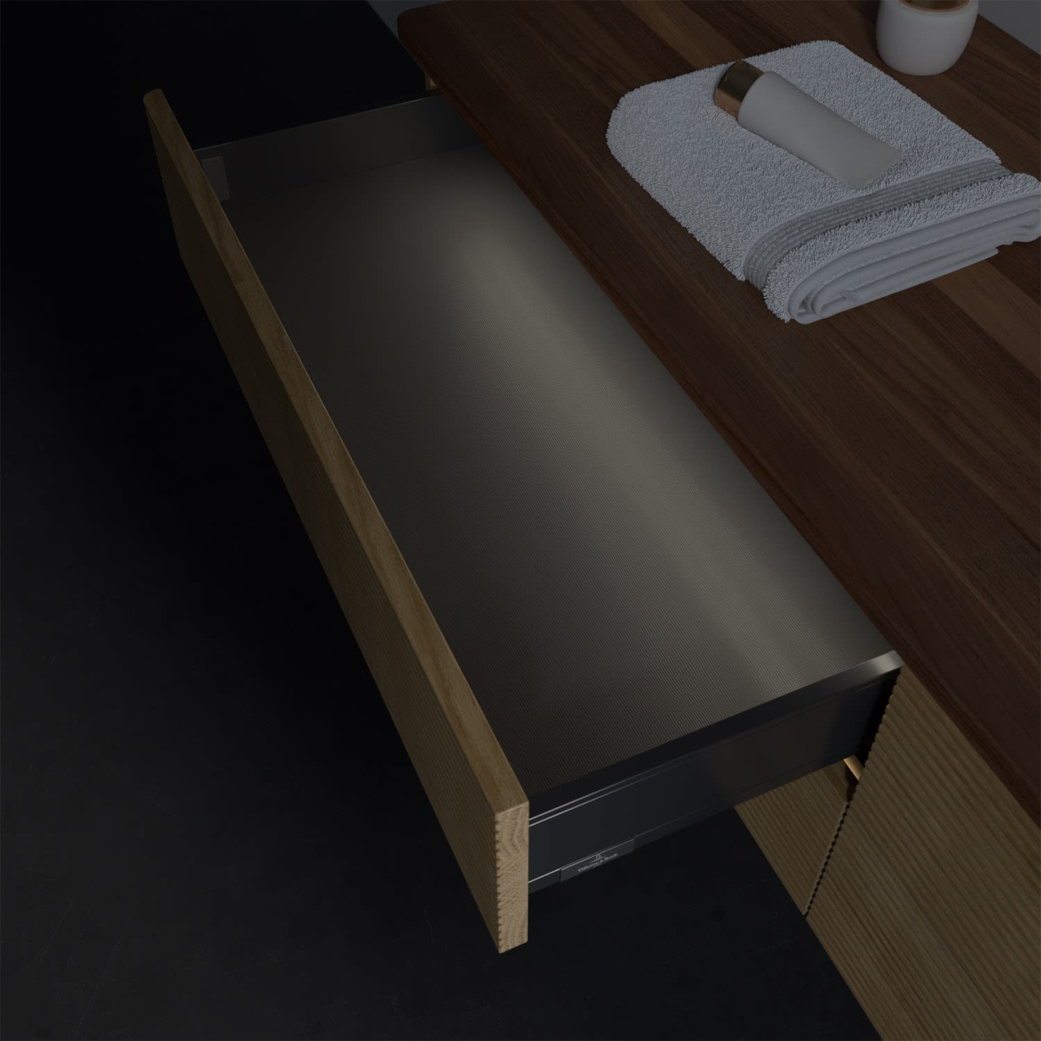 Der wandhängende Antao Waschtischunterschrank bietet mit seinen vier Auszügen und seiner erstaunlichen Größe viel Platz zum Verstauen von Utensilien im Badezimmer. Dank des seitlich platzierten Aufsatzwaschtischs gibt es daneben weiteren Platz für Handtücher, Seifenspender & Co. auf der Waschtischplatte. Inspiriert von der Natur überzeugt der Unterschrank auch optisch mit sanfter Formsprache und abgerundete Kanten. Die grifflosen Auszüge mit strukturierter Front sind mit der Push-to-Open Funktion ausgestattet und verfügen über einen Antirutschboden, damit Utensilien sicher verstaut werden können. Den Überblick behält man dank der warmweißen Auszugsbeleuchtung, die sich automatisch beim Öffnen einschaltet. Mit seiner Vollauszug- und Selbsteinzug-Funktion ist der Schrank einfach praktisch und leicht zu bedienen. Qualität von Villeroy & Boch! Für eine besonders leichte Pflege sorgt die mehrschichtig deckend lackierte Oberfläche. Bei der Ausführung in Massivholz wird dank des verarbeiteten Massivholzes jedes Möbel zu einem Unikat, das sich durch das lebendige Naturmaterial durch seine einzigartige Struktur und Maserung auszeichnet.