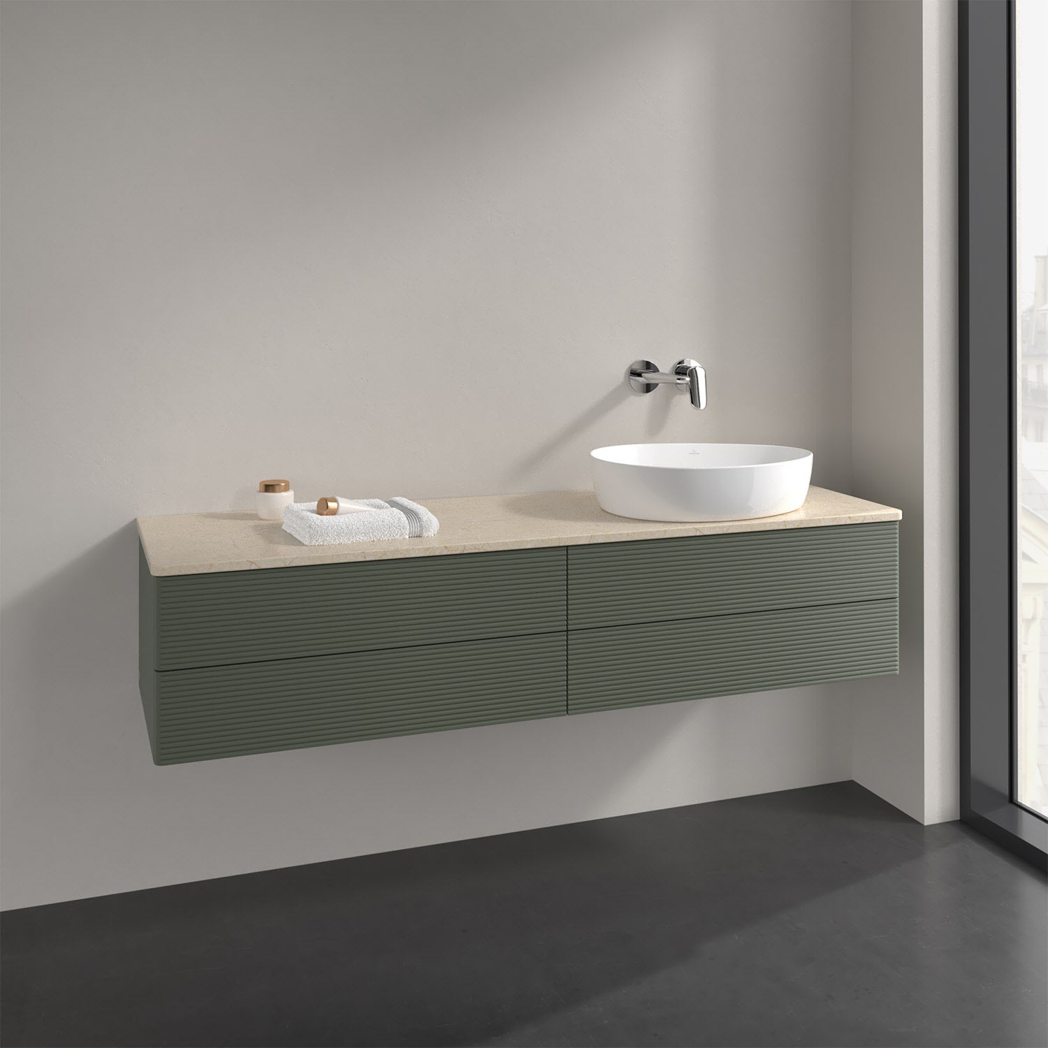 Villeroy & Boch Antao Waschbeckenunterschrank, 160 x 36 cm, 4 Auszüge mit LED-Licht, Front mit Struktur, ohne Hahnloch, für Waschtisch rechts