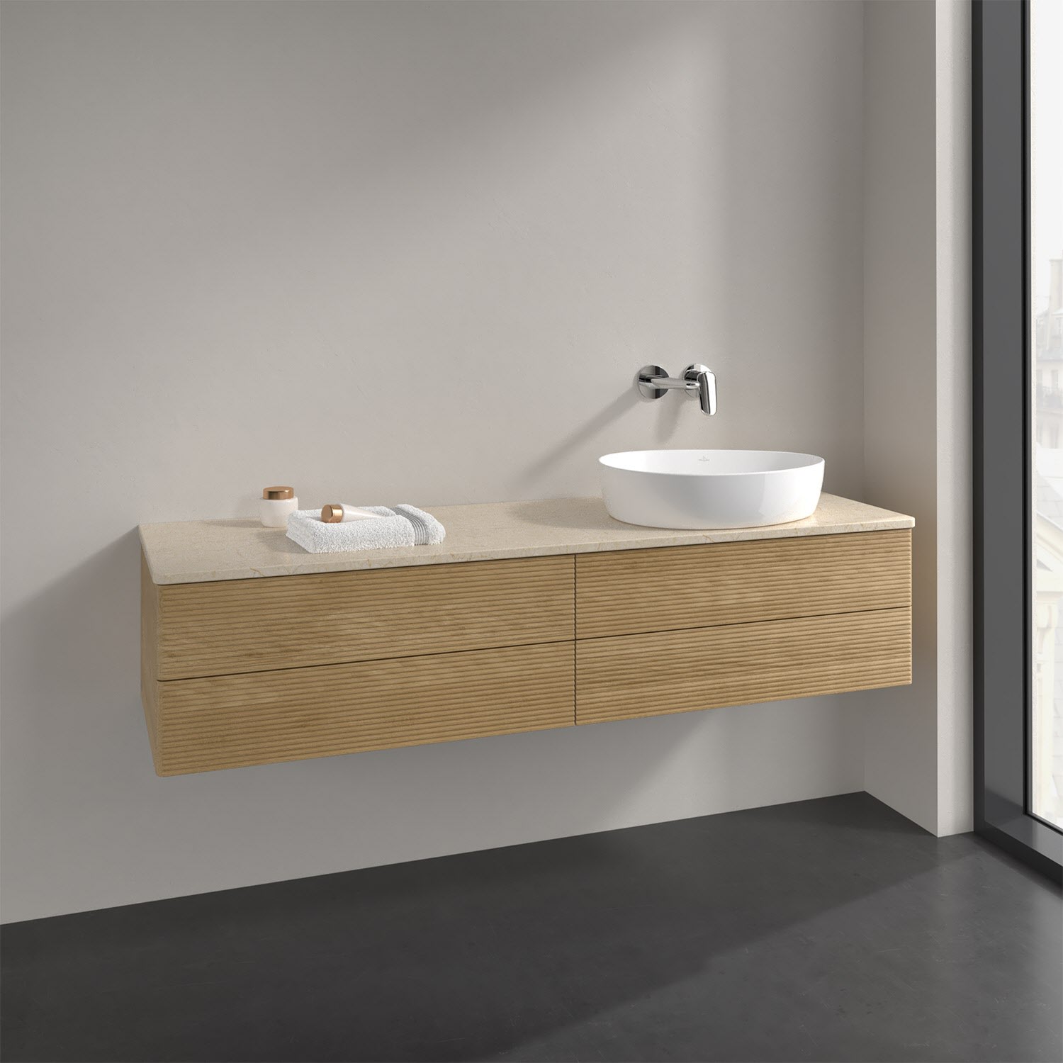 Villeroy & Boch Antao Waschbeckenunterschrank, 160 x 36 cm, 4 Auszüge mit LED-Licht, Front mit Struktur, ohne Hahnloch, für Waschtisch rechts