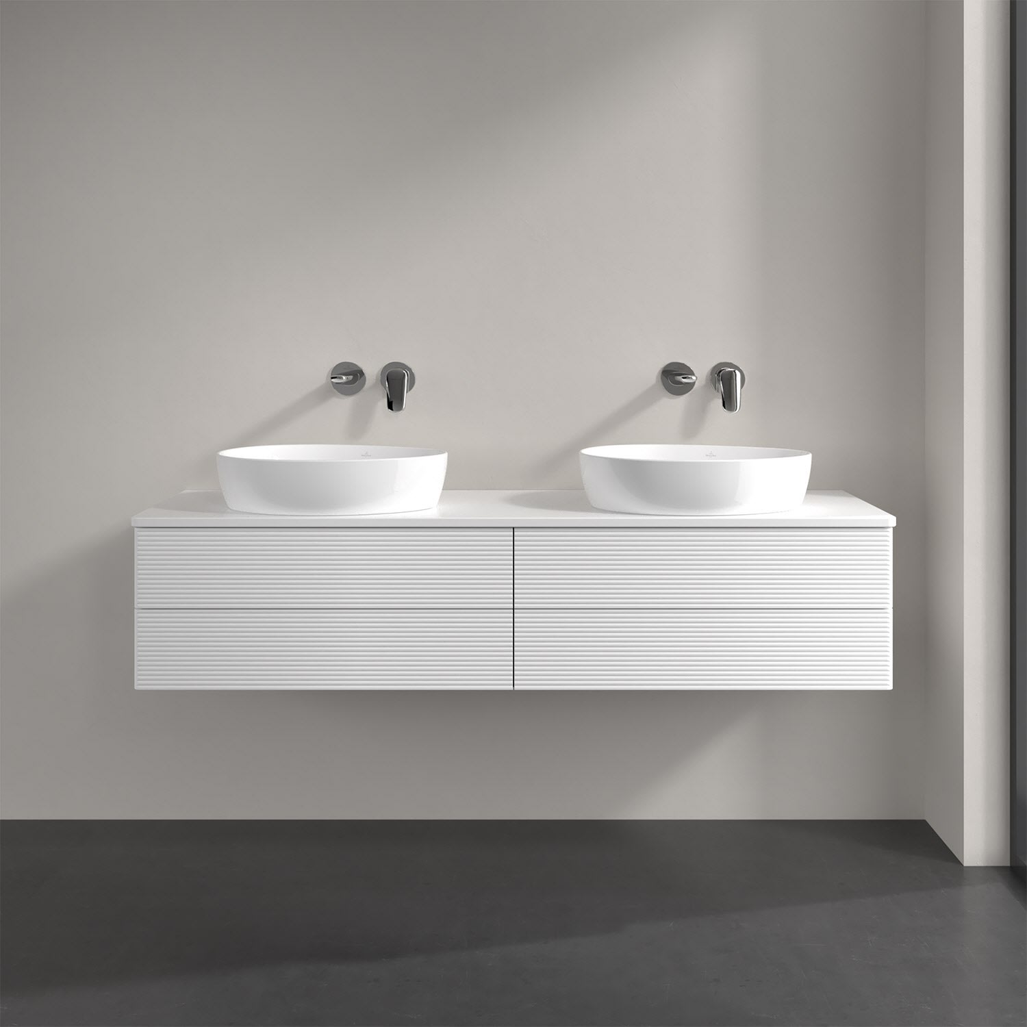 Der wandhängende Antao Waschtischunterschrank für zwei Aufsatzwaschtische bietet mit seinen vier Auszügen und seiner erstaunlichen Größe viel Platz zum Verstauen von Utensilien im Badezimmer. Inspiriert von der Natur überzeugt der Unterschrank auch optisch mit sanfter Formsprache und abgerundete Kanten. Die grifflosen Auszüge mit strukturierter Front sind mit der Push-to-Open Funktion ausgestattet und verfügen über einen Antirutschboden, damit Utensilien sicher verstaut werden können. Den Überblick behält man dank der warmweißen Auszugsbeleuchtung, die sich automatisch beim Öffnen einschaltet. Mit seiner Vollauszug- und Selbsteinzug-Funktion ist der Schrank einfach praktisch und leicht zu bedienen. Qualität von Villeroy & Boch! Für eine besonders leichte Pflege sorgt die mehrschichtig deckend lackierte Oberfläche.