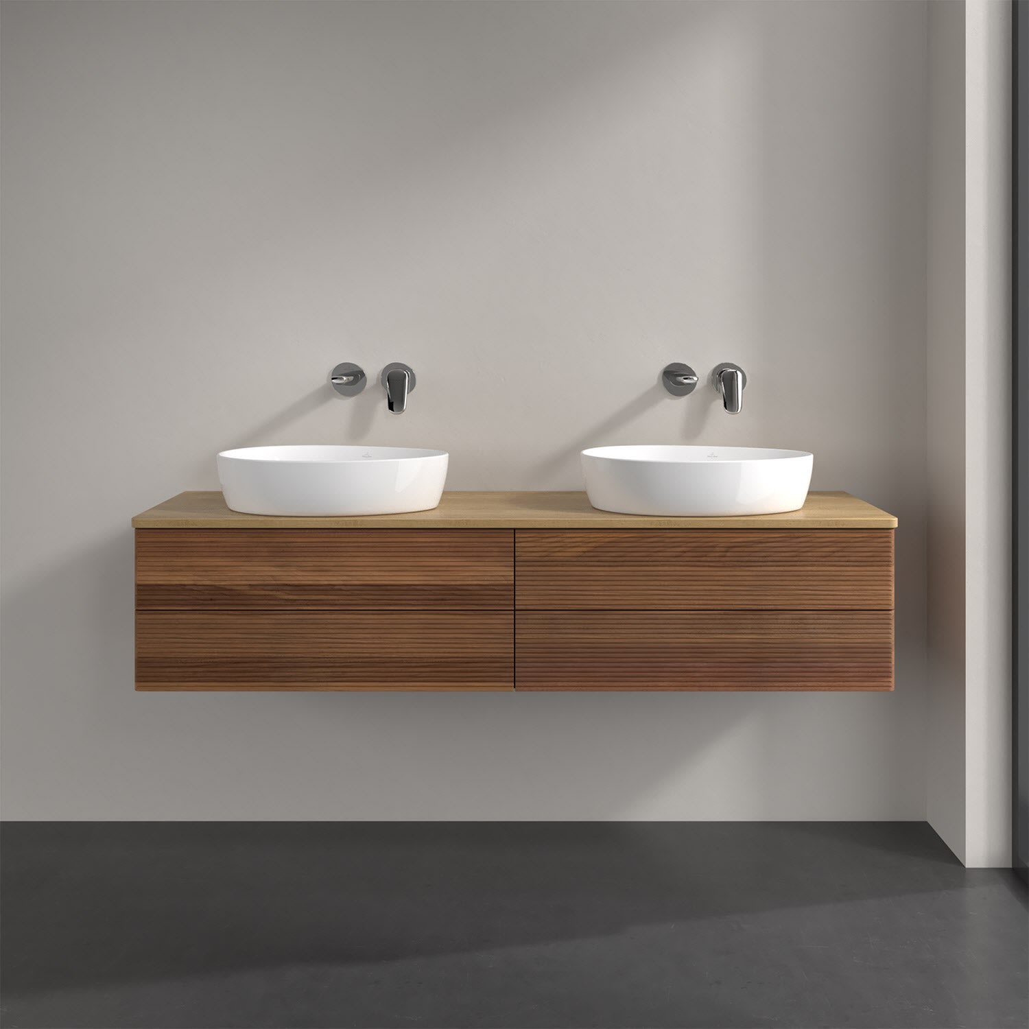 Der wandhängende Antao Waschtischunterschrank für zwei Aufsatzwaschtische bietet mit seinen vier Auszügen und seiner erstaunlichen Größe viel Platz zum Verstauen von Utensilien im Badezimmer. Inspiriert von der Natur überzeugt der Unterschrank auch optisch mit sanfter Formsprache und abgerundete Kanten. Die grifflosen Auszüge mit strukturierter Front sind mit der Push-to-Open Funktion ausgestattet und verfügen über einen Antirutschboden, damit Utensilien sicher verstaut werden können. Den Überblick behält man dank der warmweißen Auszugsbeleuchtung, die sich automatisch beim Öffnen einschaltet. Mit seiner Vollauszug- und Selbsteinzug-Funktion ist der Schrank einfach praktisch und leicht zu bedienen. Qualität von Villeroy & Boch! Für eine besonders leichte Pflege sorgt die mehrschichtig deckend lackierte Oberfläche. Bei der Ausführung in Massivholz wird dank des verarbeiteten Massivholzes jedes Möbel zu einem Unikat, das sich durch das lebendige Naturmaterial durch seine einzigartige Struktur und Maserung auszeichnet.