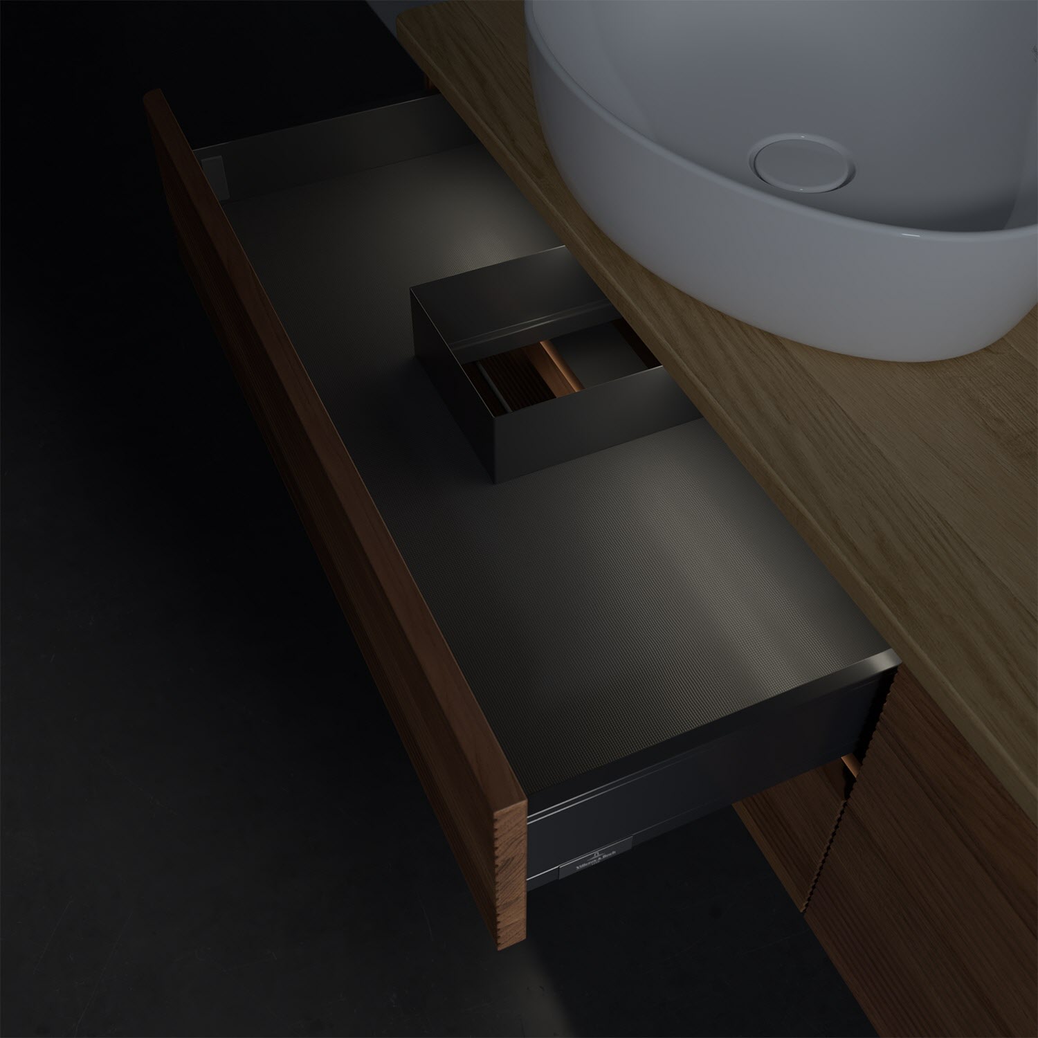 - in Schublade integrierte LED-Leiste mit warmweißem Licht zur Beleuchtung des Innenlebens