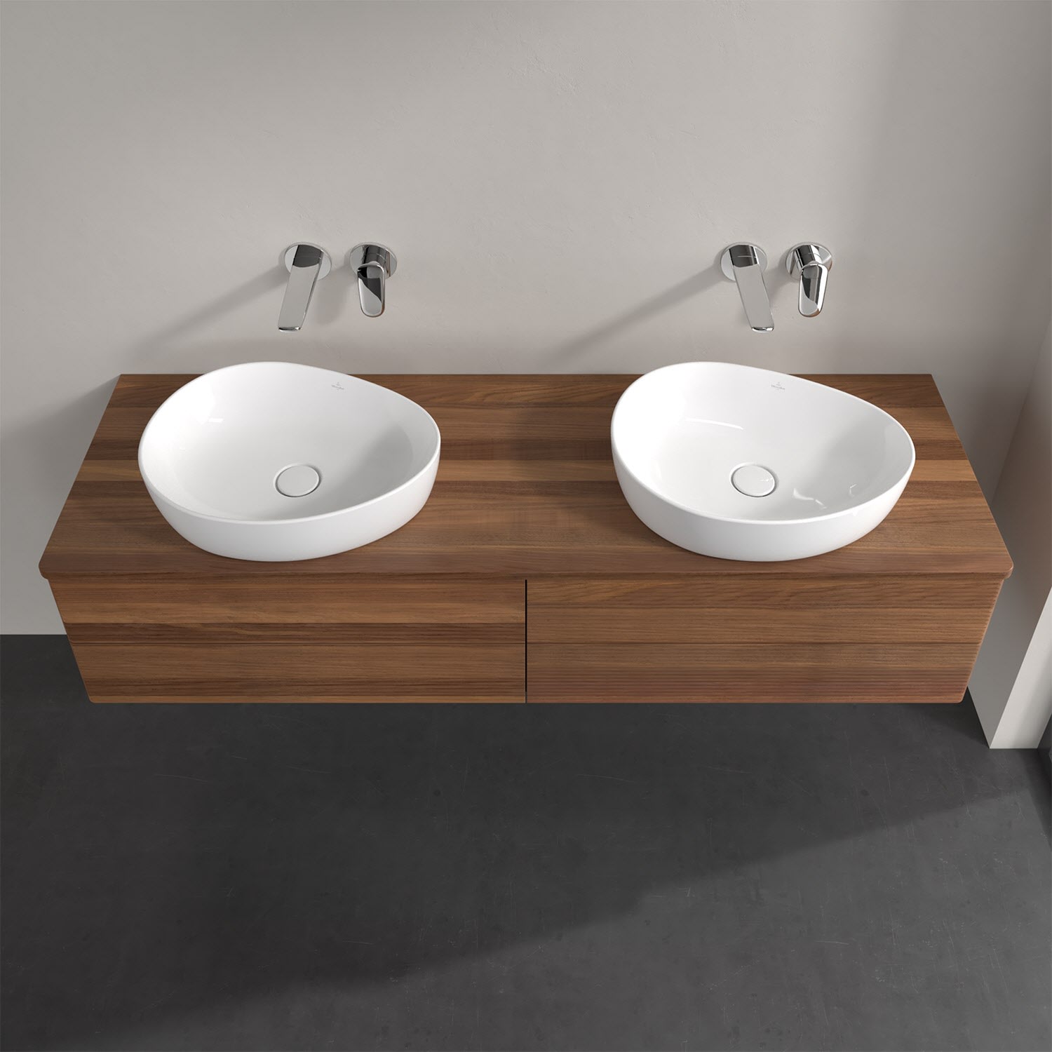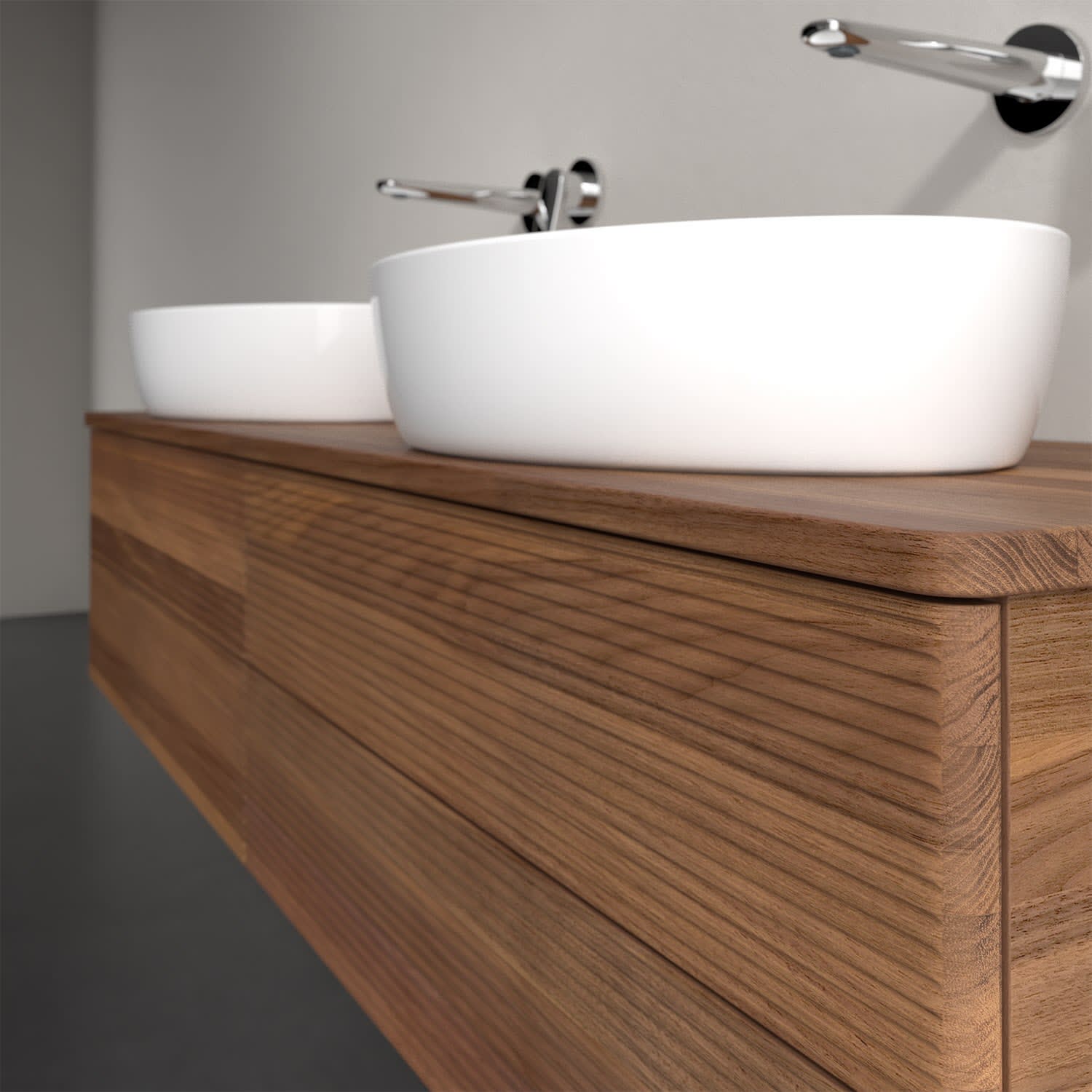 Der wandhängende Antao Waschtischunterschrank für zwei Aufsatzwaschtische bietet mit seinen vier Auszügen und seiner erstaunlichen Größe viel Platz zum Verstauen von Utensilien im Badezimmer. Inspiriert von der Natur überzeugt der Unterschrank auch optisch mit sanfter Formsprache und abgerundete Kanten. Die grifflosen Auszüge mit strukturierter Front sind mit der Push-to-Open Funktion ausgestattet und verfügen über einen Antirutschboden, damit Utensilien sicher verstaut werden können. Den Überblick behält man dank der warmweißen Auszugsbeleuchtung, die sich automatisch beim Öffnen einschaltet. Mit seiner Vollauszug- und Selbsteinzug-Funktion ist der Schrank einfach praktisch und leicht zu bedienen. Qualität von Villeroy & Boch! Für eine besonders leichte Pflege sorgt die mehrschichtig deckend lackierte Oberfläche. Bei der Ausführung in Massivholz wird dank des verarbeiteten Massivholzes jedes Möbel zu einem Unikat, das sich durch das lebendige Naturmaterial durch seine einzigartige Struktur und Maserung auszeichnet.