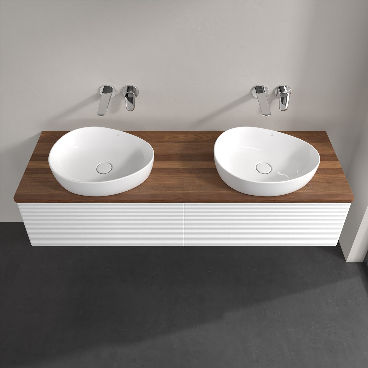 Der wandhängende Antao Waschtischunterschrank für zwei Aufsatzwaschtische bietet mit seinen vier Auszügen und seiner erstaunlichen Größe viel Platz zum Verstauen von Utensilien im Badezimmer. Inspiriert von der Natur überzeugt der Unterschrank auch optisch mit sanfter Formsprache und abgerundete Kanten. Die grifflosen Auszüge mit strukturierter Front sind mit der Push-to-Open Funktion ausgestattet und verfügen über einen Antirutschboden, damit Utensilien sicher verstaut werden können. Den Überblick behält man dank der warmweißen Auszugsbeleuchtung, die sich automatisch beim Öffnen einschaltet. Mit seiner Vollauszug- und Selbsteinzug-Funktion ist der Schrank einfach praktisch und leicht zu bedienen. Qualität von Villeroy & Boch! Für eine besonders leichte Pflege sorgt die mehrschichtig deckend lackierte Oberfläche. Bei der Ausführung in Massivholz wird dank des verarbeiteten Massivholzes jedes Möbel zu einem Unikat, das sich durch das lebendige Naturmaterial durch seine einzigartige Struktur und Maserung auszeichnet.
