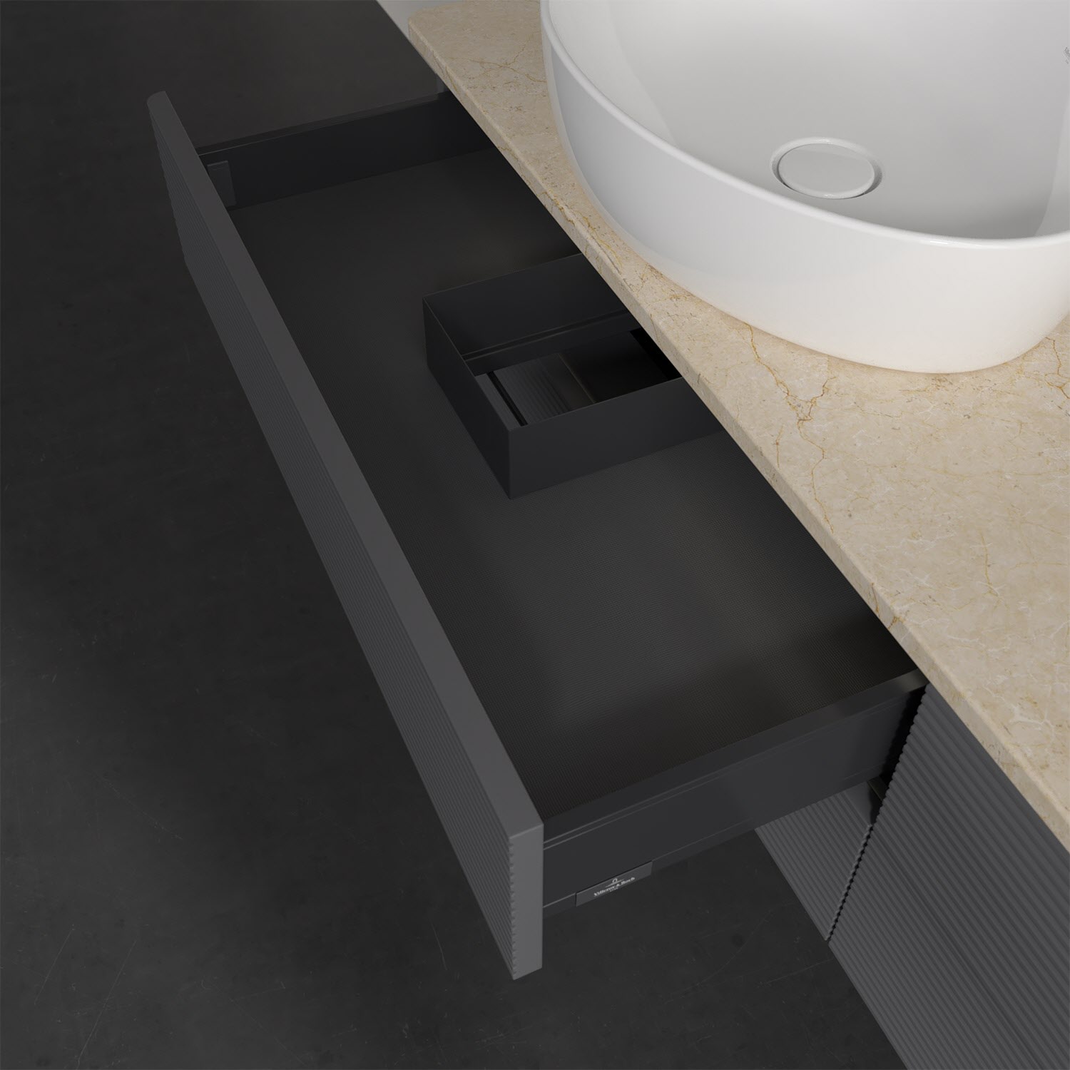 - kein Umfallen oder Verrutschen von Pflegeprodukten in den Schubladen dank rutschhemmendem Boden